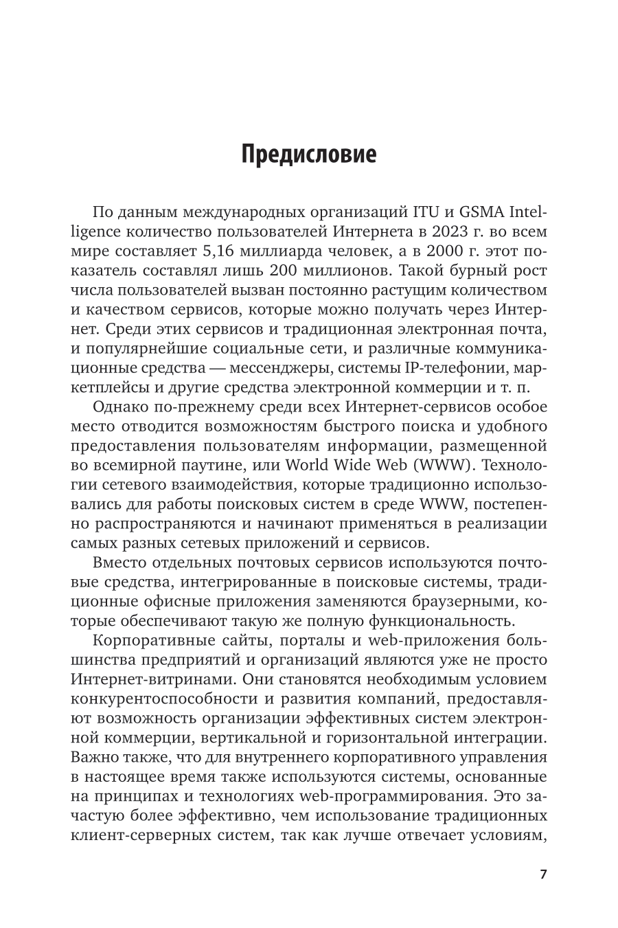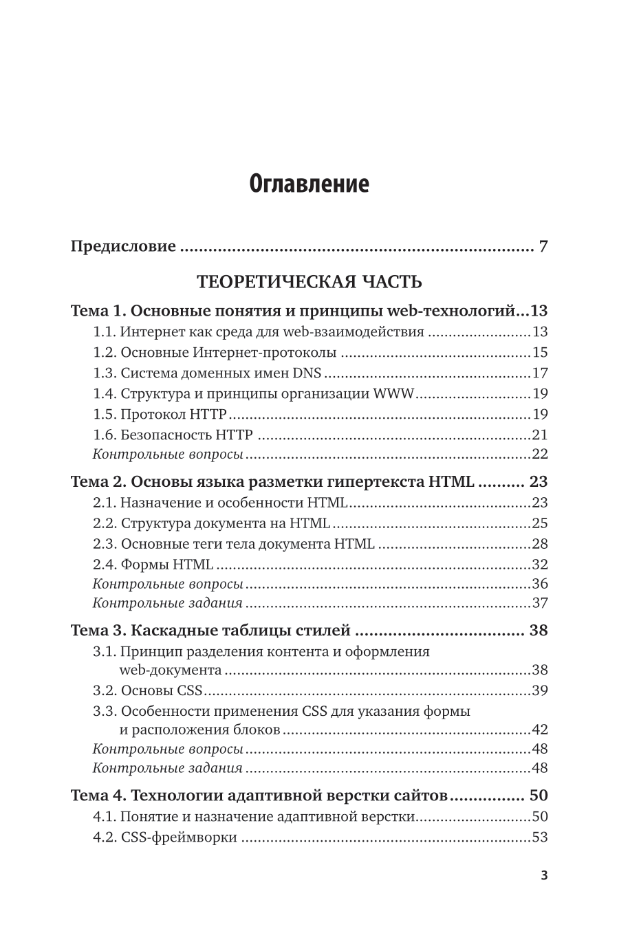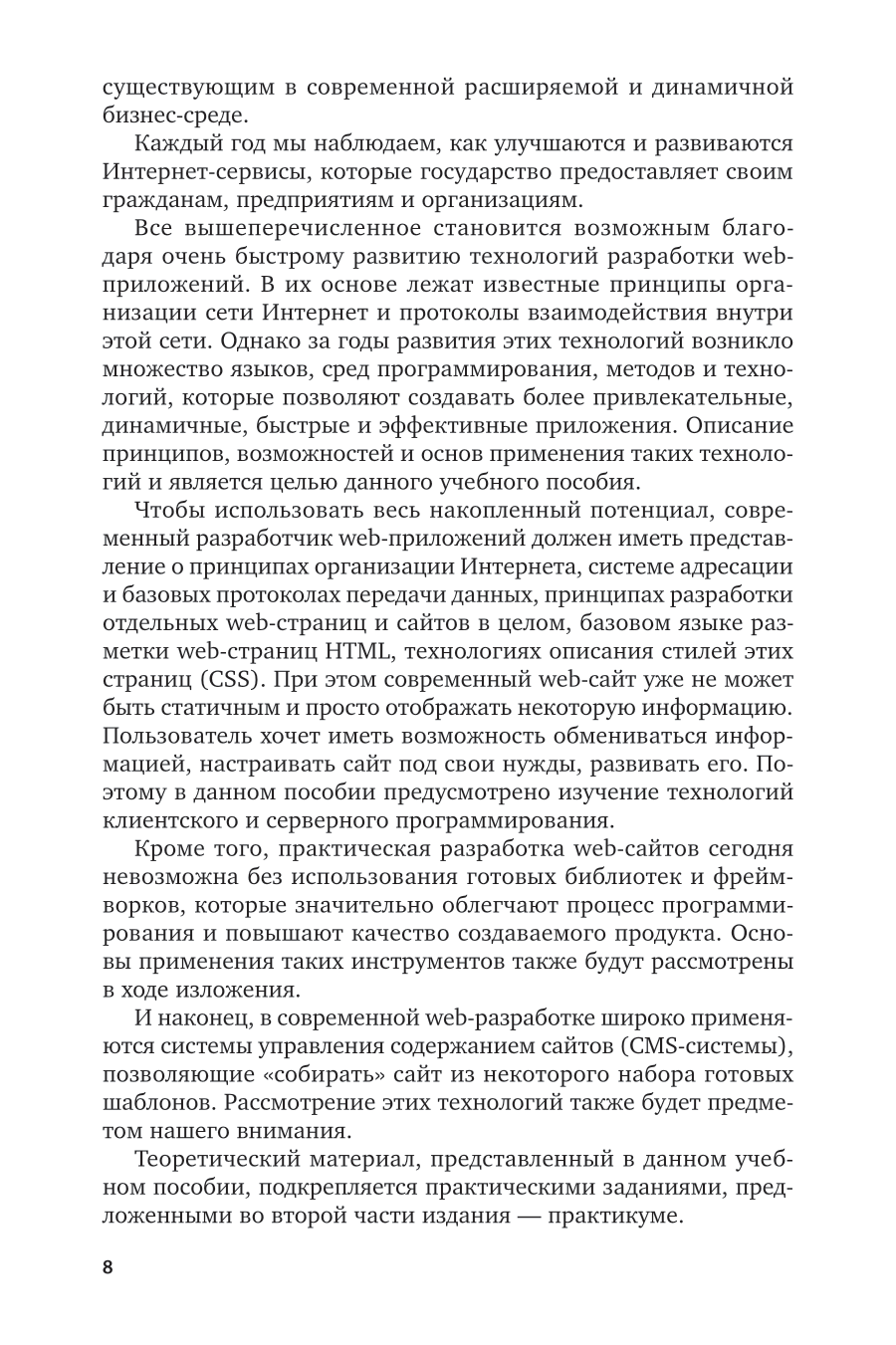 Курс содержит теоретический материал и комплект практических работ, позволяющих изучить современные подходы, технологии и инструменты, используемые при разработке web-приложений. Среди них: принципы организации сети Интернет; базовый язык разметки web-страниц HTML, технологии описания стилей этих страниц СSS; технологии браузерного программирования на основе языка JavaScript, современные средства адаптивной верстки сайтов; основные принципы, технологии и инструментальные средства серверной обработки запросов и хранения информации web-приложений. В курсе рассмотрены возможности библиотек программ и фреймворков описанных языков программирования, а также кратко излагаются основы применения CMS-систем. Соответствует актуальным требованиям Федерального государственного образовательного стандарта высшего образования. Издание адресовано студентам высших учебных заведений, обучающимся по ИТ-направлениям.