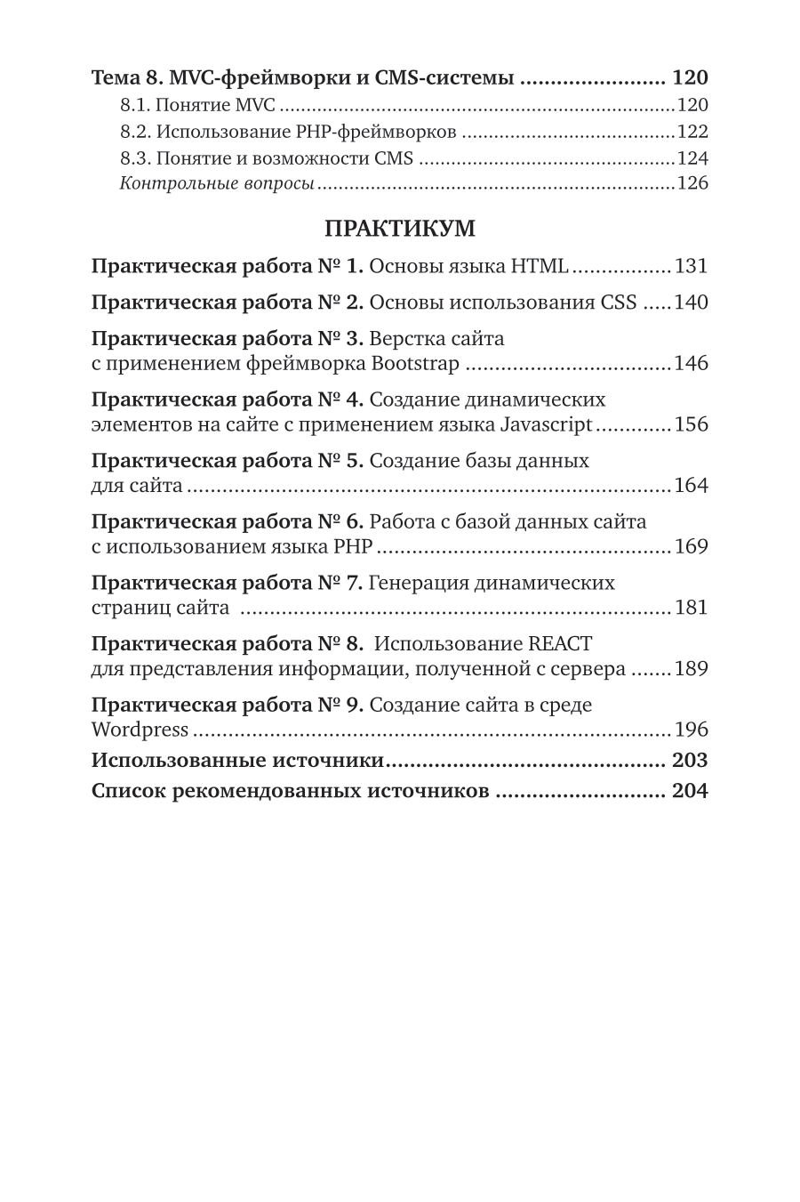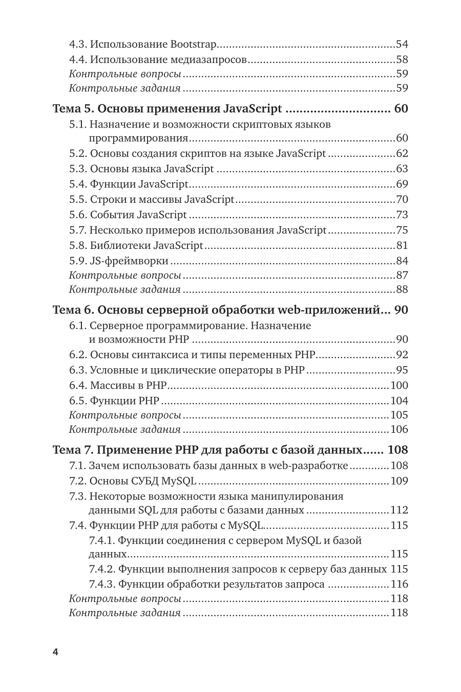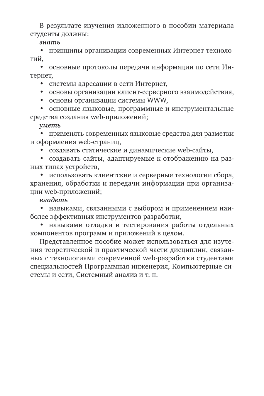 Курс содержит теоретический материал и комплект практических работ, позволяющих изучить современные подходы, технологии и инструменты, используемые при разработке web-приложений. Среди них: принципы организации сети Интернет; базовый язык разметки web-страниц HTML, технологии описания стилей этих страниц СSS; технологии браузерного программирования на основе языка JavaScript, современные средства адаптивной верстки сайтов; основные принципы, технологии и инструментальные средства серверной обработки запросов и хранения информации web-приложений. В курсе рассмотрены возможности библиотек программ и фреймворков описанных языков программирования, а также кратко излагаются основы применения CMS-систем. Соответствует актуальным требованиям Федерального государственного образовательного стандарта высшего образования. Издание адресовано студентам высших учебных заведений, обучающимся по ИТ-направлениям.