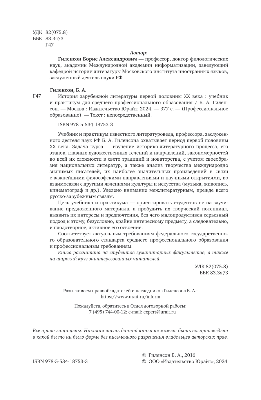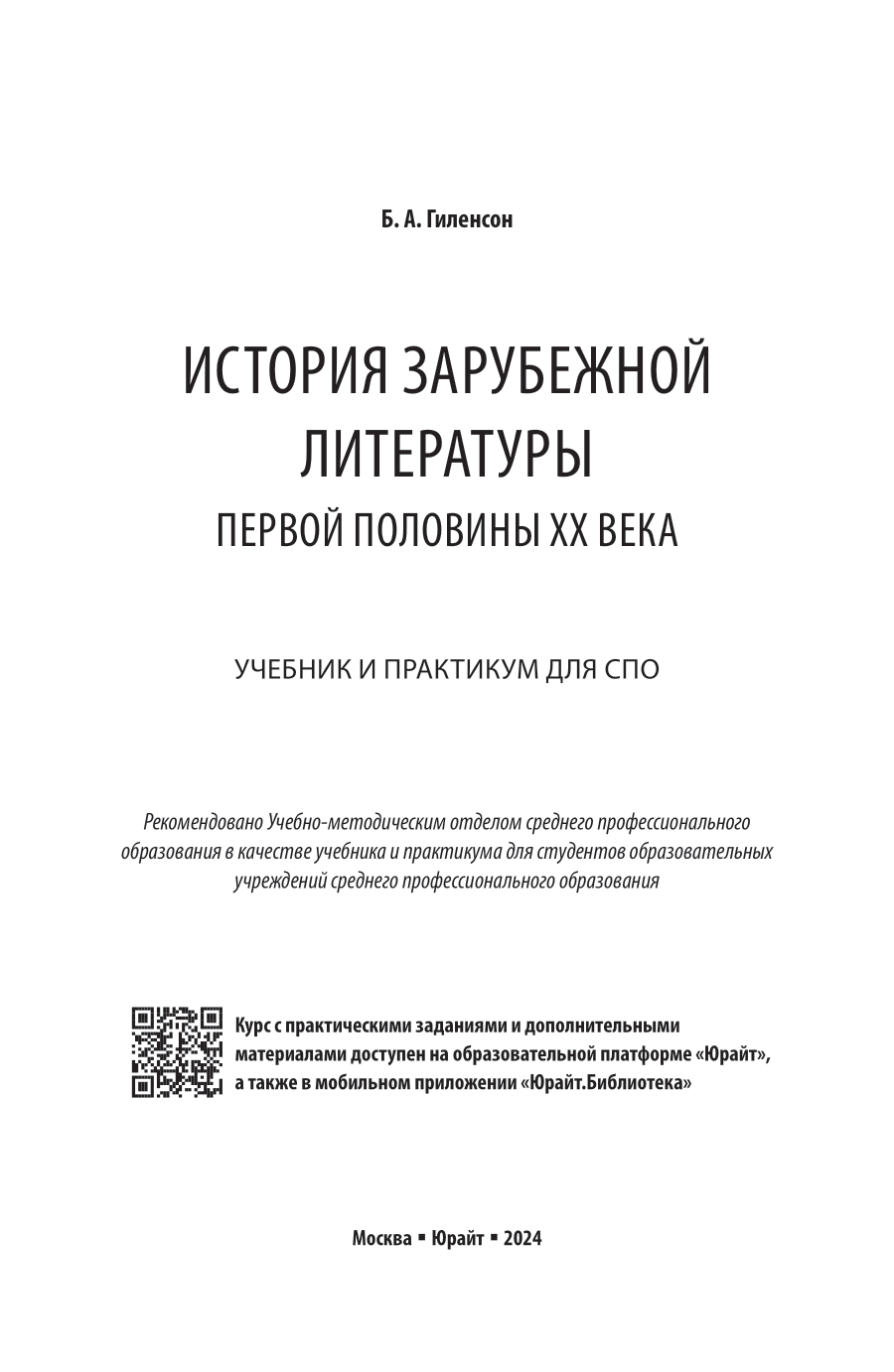 История зарубежной литературы первой половины XX века. Учебник и практикум для СПО (Борис Александрович Гиленсон); ЮРАЙТ, 2024