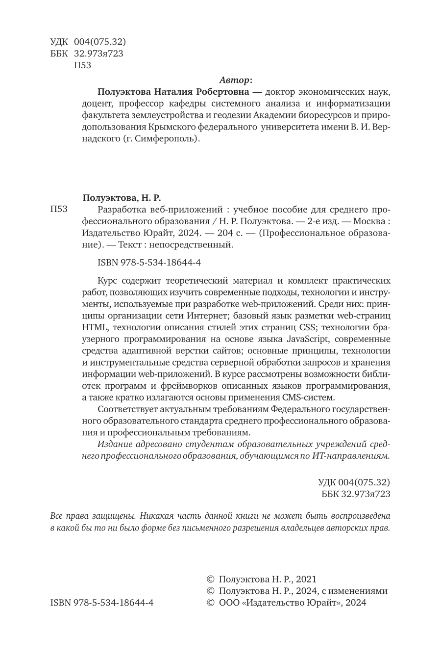 Разработка веб-приложений 2-е изд. Учебное пособие для СПО (Наталия Робертовна Полуэктова); ЮРАЙТ, 2024