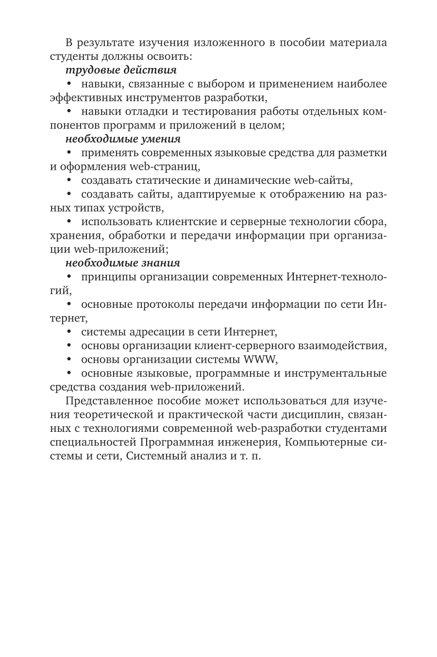 Курс содержит теоретический материал и комплект практических работ, позволяющих изучить современные подходы, технологии и инструменты, используемые при разработке web-приложений. Среди них: принципы организации сети Интернет; базовый язык разметки web-страниц HTML, технологии описания стилей этих страниц СSS; технологии браузерного программирования на основе языка JavaScript, современные средства адаптивной верстки сайтов; основные принципы, технологии и инструментальные средства серверной обработки запросов и хранения информации web-приложений. В курсе рассмотрены возможности библиотек программ и фреймворков описанных языков программирования, а также кратко излагаются основы применения CMS-систем. Соответствует актуальным требованиям Федерального государственного образовательного стандарта среднего профессионального образования и профессиональным требованиям. Издание адресовано студентам образовательных учреждений среднего профессионального образования, обучающимся по ИТ-направлениям.