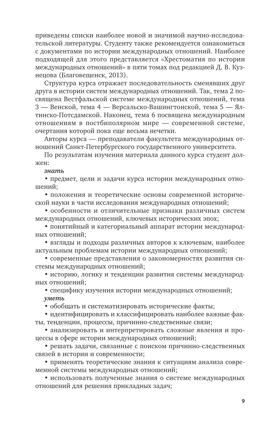 В курсе рассматривается история международных отношений XVI-XXI вв., раскрываются ключевые внешнеполитические события и процессы данного периода, с указанием их причинно-следственной связи. Опираясь на материалы новейших исследований, авторы излагают этапы становления, особенности функционирования и причины распада отдельных систем международных отношений, а именно: систем раннего Нового времени, Вестфальской, Венской, Версальско-Вашингтонской, Ялтинско-Потсдамской и современной систем. Данный курс направлен на формирование у студента как знания истории международных отношений, так и навыка самостоятельного анализа внешнеполитических процессов. Этому способствуют приведенные в каждой теме аналитические вопросы и списки подобранной авторами рекомендуемой литературы. Соответствует актуальным требованиям федерального государственного образовательного стандарта высшего образования. Для студентов высших учебных заведений, обучающихся по гуманитарным направлениям.