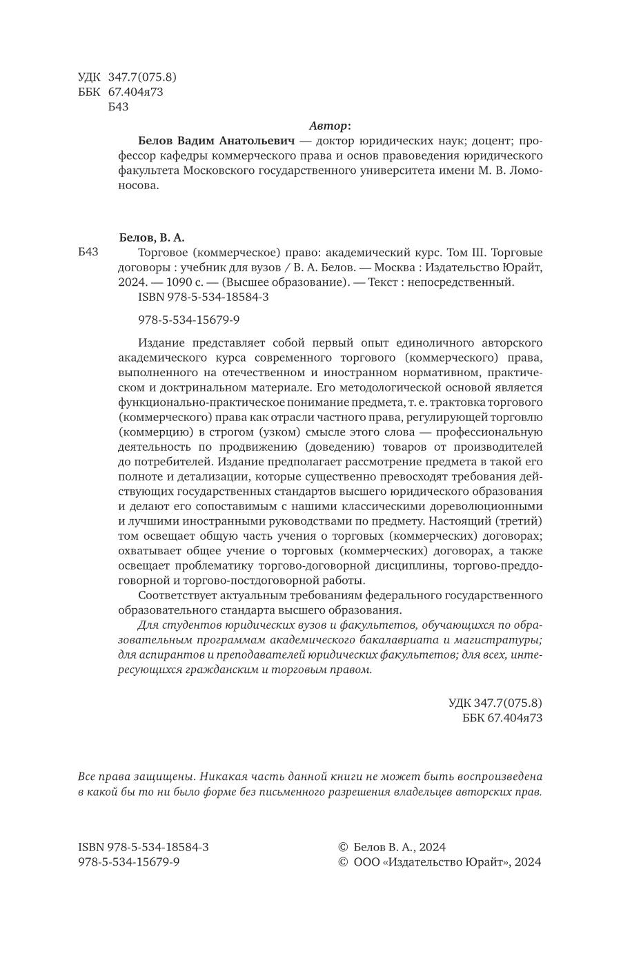 Торговое (коммерческое) право: академический курс. Торговые договоры. Учебник для вузов (Вадим Анатольевич Белов); ЮРАЙТ, 2024