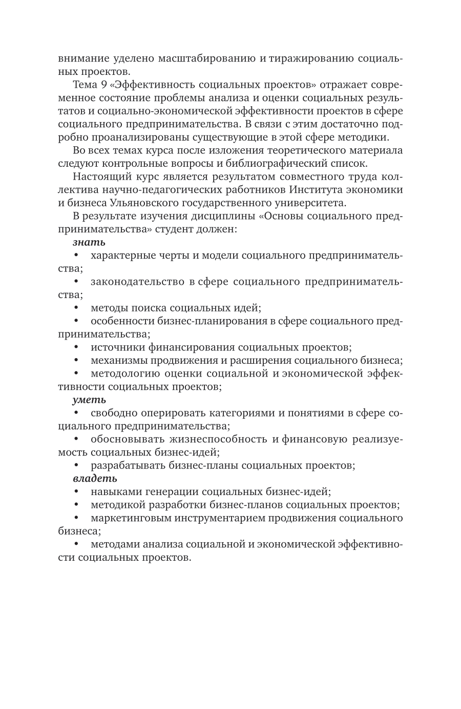 Предлагаемый курс впервые комплексно рассматривает проблемы, связанные с организацией социального предпринимательства и реализацией социальных проектов. В краткой форме изложены теоретические аспекты социального предпринимательства, его нормативно-правовое обеспечение, особенности бизнес-моделей и бизнес-планирования в социальном предпринимательстве, вопросы финансирования, управления персоналом и управления продажами социальных предприятий, развития и оценки эффективности социальных проектов. Соответствует актуальным требованиям федерального государственного образовательного стандарта высшего образования. Курс предназначен для студентов высших учебных заведений, обучающихся по экономическим, социально-экономическим направлениям, а также может быть полезен широкому кругу читателей, чья деятельность связана с разработкой и реализацией социальных проектов.