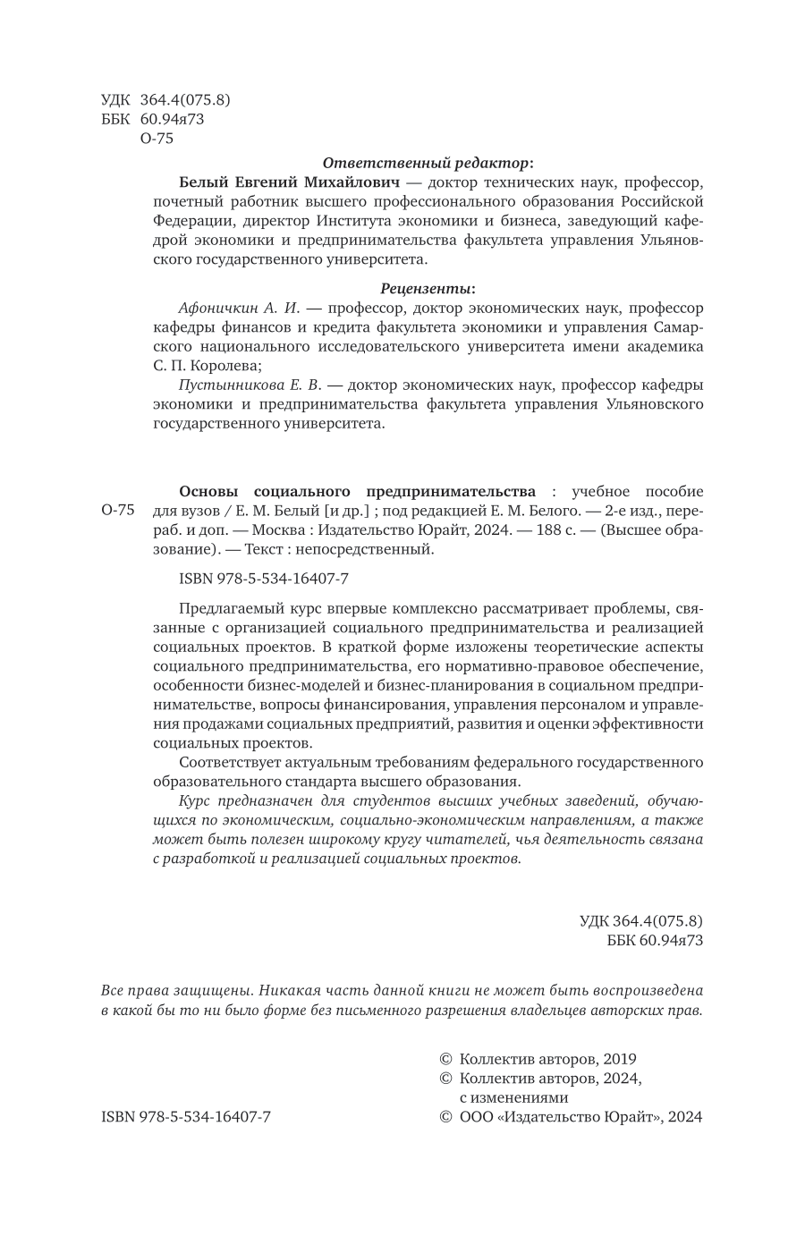 Основы социального предпринимательства 2-е изд. пер. и доп. Учебное пособие для вузов (Белый Евгений Михайлович; Бакальская Елена Викторовна; Зимина Лариса Юрьевна; Романова Ирина Борисовна; Рожкова Екатерина Владимировна), 2024