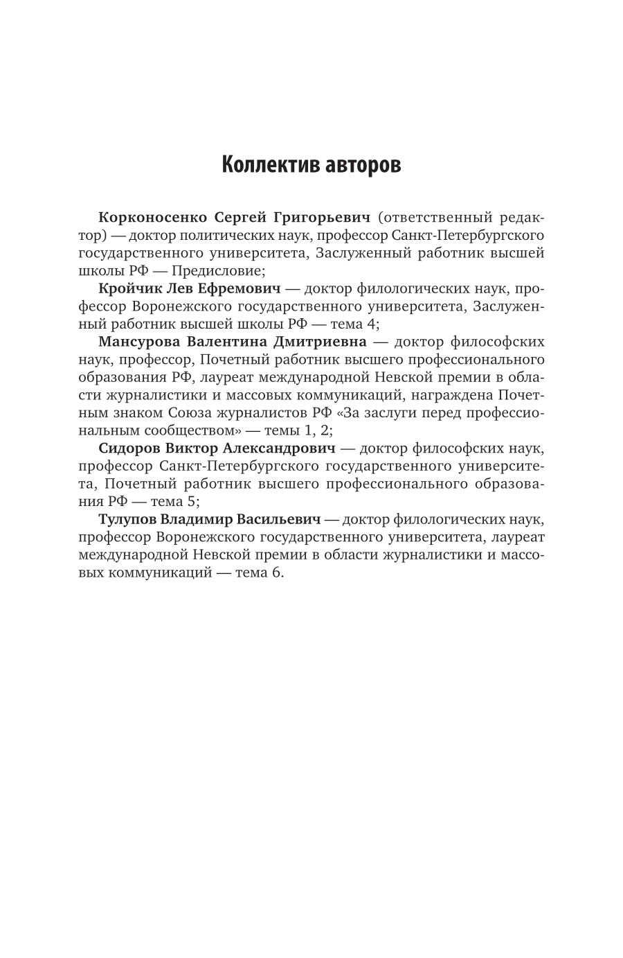В учебнике рассматриваются профессиональные знания и умения в тесной связи с технико-технологическим прогрессом в информационной отрасли. Освещены виды журналистской деятельности, источники и методы получения информации, профессиональные обязанности журналиста. Авторы стремились представить журналистскую деятельность как производственную, которая в свою очередь включает в себя участие в планировании и организации работы редакции, взаимодействие с внутриредакционными и внешними партнерами и многое другое. Кроме того, в учебнике представлены материалы, показывающие деятельность прессы на разных территориально-географических уровнях. Изложение материала сопровождается многочисленными примерами из редакционной практики. В структуру учебника включены вопросы и задания для самопроверки.