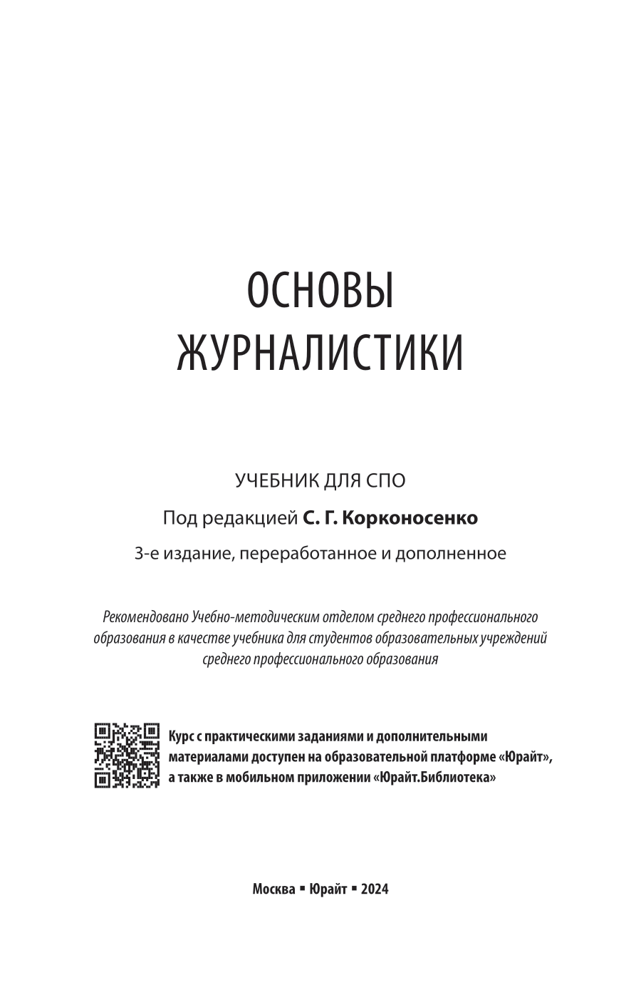 Основы журналистики 3-е изд. пер. и доп. Учебник для СПО (Сергей Григорьевич Корконосенко); ЮРАЙТ, 2024