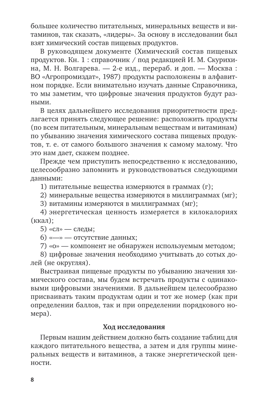 В работе разъясняется порядок расположения продуктов питания в зависимости от уровня содержания в них питательных и минеральных веществ, а также витаминов и энергетической ценности с целью использования их в соответствии с принципами рационального питания. Соответствует актуальным требованиям федерального государственного образовательного стандарта высшего образования. Данные этой работы предназначены для использования их в учебном процессе институтов питания и других высших учебных заведений, при планировании питания в санаториях и домах отдыха, лечебных учреждениях, а также в повседневной жизнедеятельности человека.