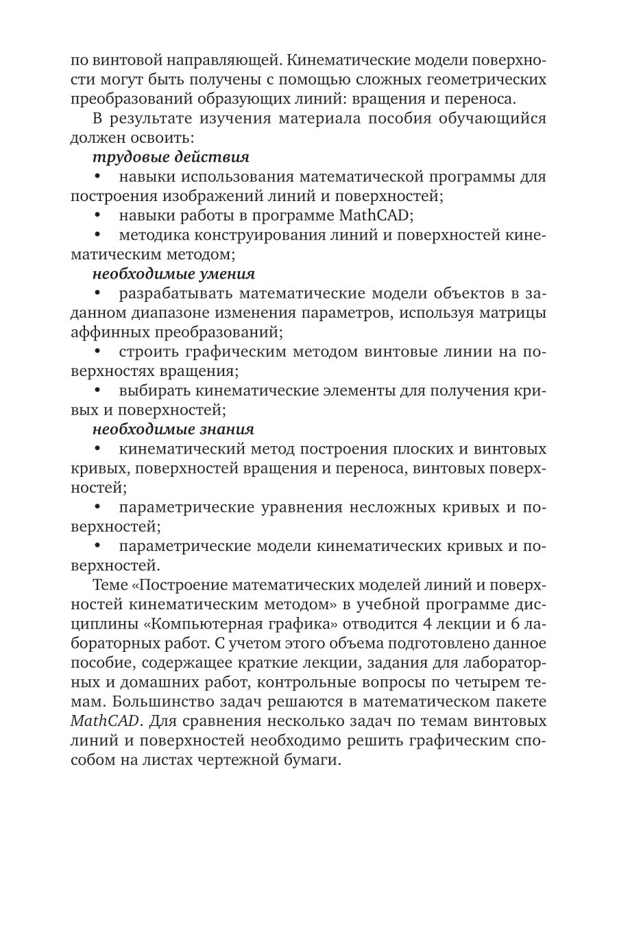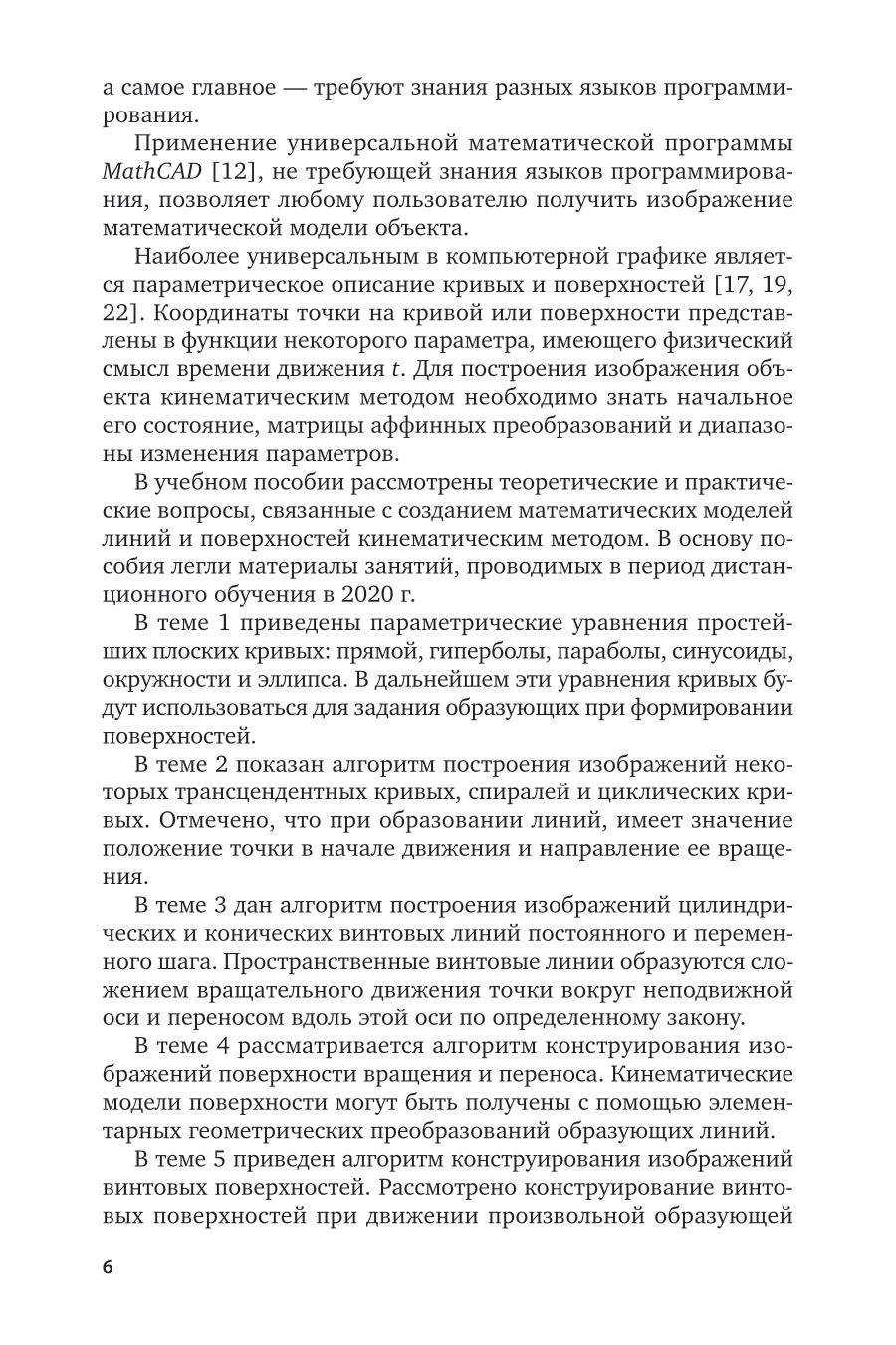 В учебном пособии рассмотрены теоретические и практические вопросы, связанные с созданием математических моделей линий и поверхностей кинематическим методом. В основу пособия легли материалы занятий, проводимых в период дистанционного обучения в 2020 г. Соответствует актуальным требованиям федерального государственного образовательного стандарта высшего образования. Пособие разработано для студентов, обучающихся по инженерно-техническим и математическим направлениям.
