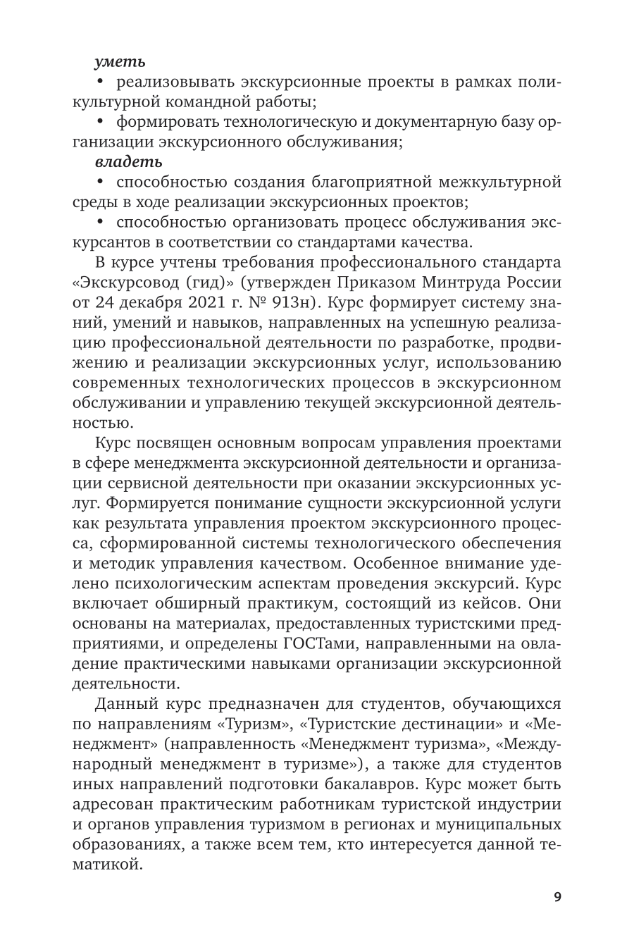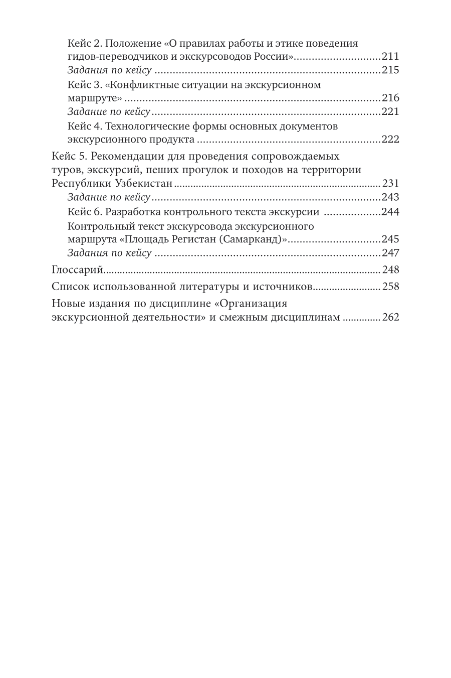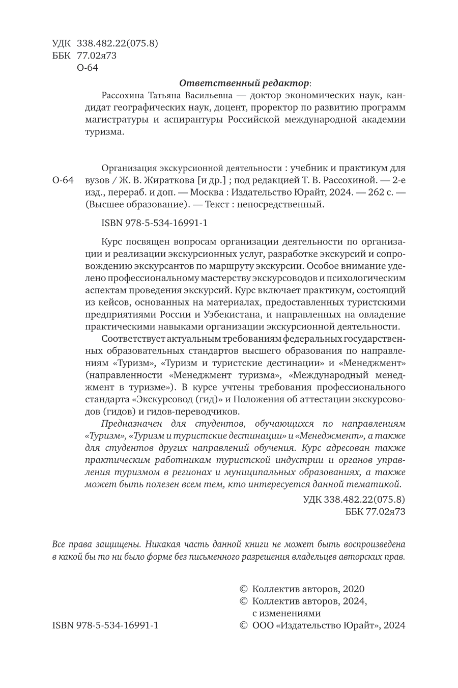 Курс посвящен вопросам организации деятельности по организации и реализации экскурсионных услуг, разработке экскурсий и сопровождению экскурсантов по маршруту экскурсии. Особое внимание уделено профессиональному мастерству экскурсоводов и психологическим аспектам проведения экскурсий. Курс включает практикум, состоящий из кейсов, основанных на материалах, предоставленных туристскими предприятиями России и Узбекистана, и направленных на овладение практическими навыками организации экскурсионной деятельности. Соответствует актуальным требованиям федеральных государственных образовательных стандартов высшего образования по направлениям «Туризм», «Туризм и туристские дестинации» и «Менеджмент» (направленности «Менеджмент туризма», «Международный менеджмент в туризме»). В курсе учтены требования профессионального стандарта «Экскурсовод (гид)» и Положения об аттестации экскурсоводов (гидов) и гидов-переводчиков. Предназначен для студентов, обучающихся по направлениям «Туризм», «Туризм и туристские дестинации» и «Менеджмент», а также для студентов других направлений обучения. Курс адресован также практическим работникам туристской индустрии и органов управления туризмом в регионах и муниципальных образованиях, а также может быть полезен всем тем, кто интересуется данной тематикой.