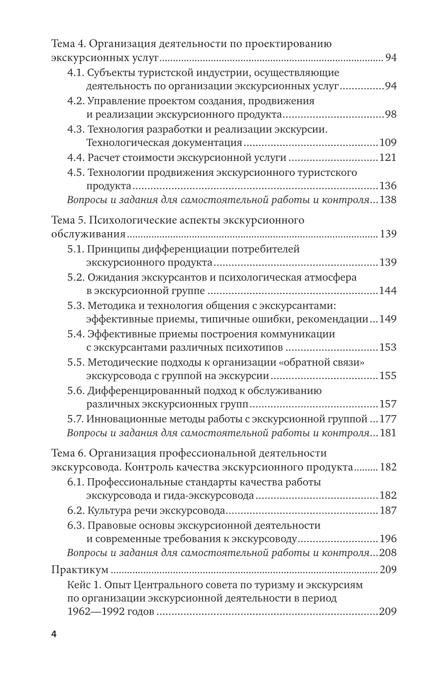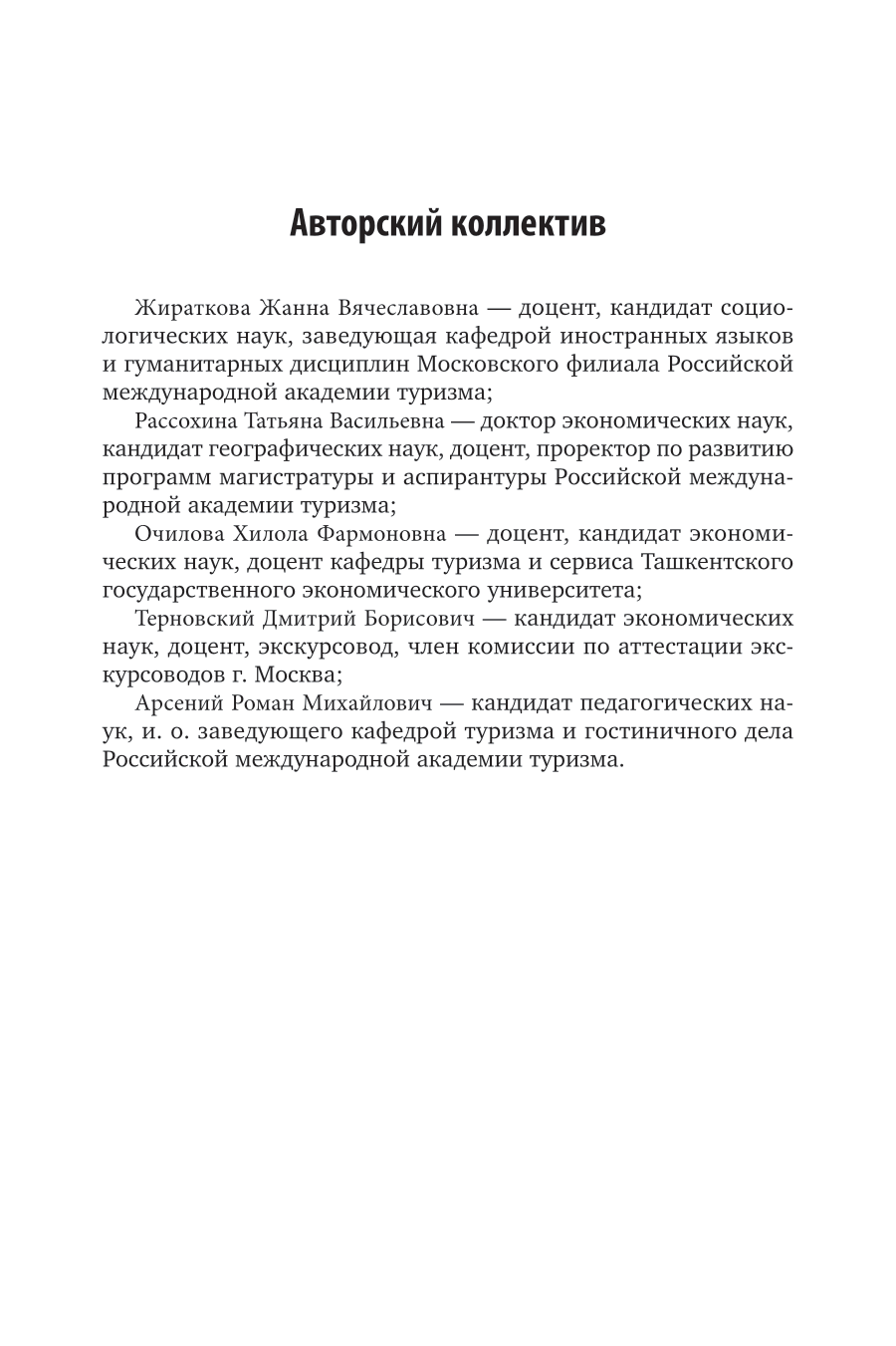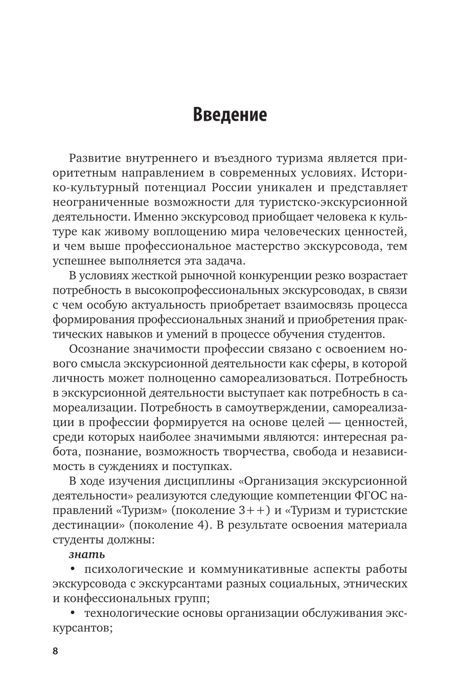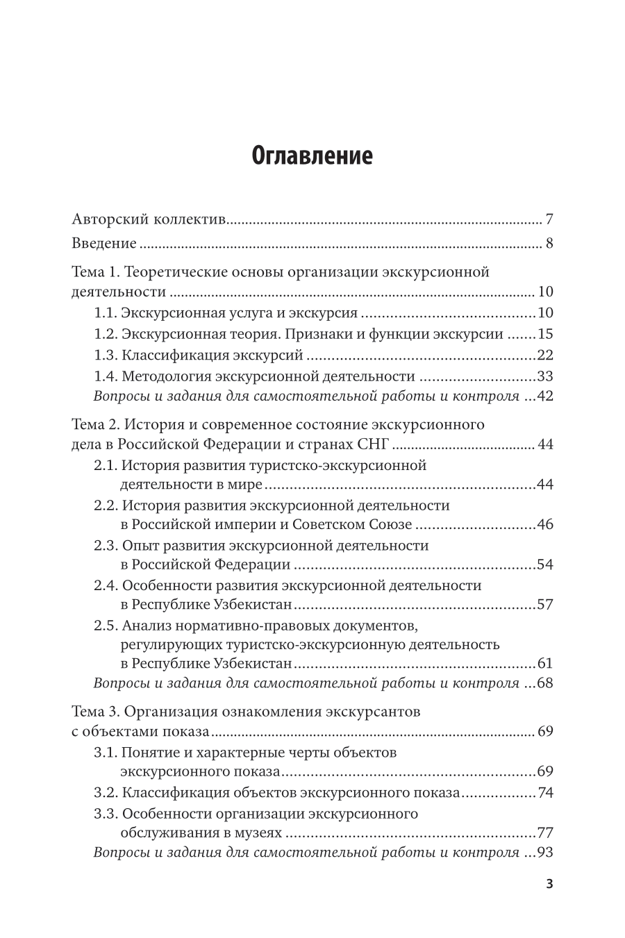 Курс посвящен вопросам организации деятельности по организации и реализации экскурсионных услуг, разработке экскурсий и сопровождению экскурсантов по маршруту экскурсии. Особое внимание уделено профессиональному мастерству экскурсоводов и психологическим аспектам проведения экскурсий. Курс включает практикум, состоящий из кейсов, основанных на материалах, предоставленных туристскими предприятиями России и Узбекистана, и направленных на овладение практическими навыками организации экскурсионной деятельности. Соответствует актуальным требованиям федеральных государственных образовательных стандартов высшего образования по направлениям «Туризм», «Туризм и туристские дестинации» и «Менеджмент» (направленности «Менеджмент туризма», «Международный менеджмент в туризме»). В курсе учтены требования профессионального стандарта «Экскурсовод (гид)» и Положения об аттестации экскурсоводов (гидов) и гидов-переводчиков. Предназначен для студентов, обучающихся по направлениям «Туризм», «Туризм и туристские дестинации» и «Менеджмент», а также для студентов других направлений обучения. Курс адресован также практическим работникам туристской индустрии и органов управления туризмом в регионах и муниципальных образованиях, а также может быть полезен всем тем, кто интересуется данной тематикой.