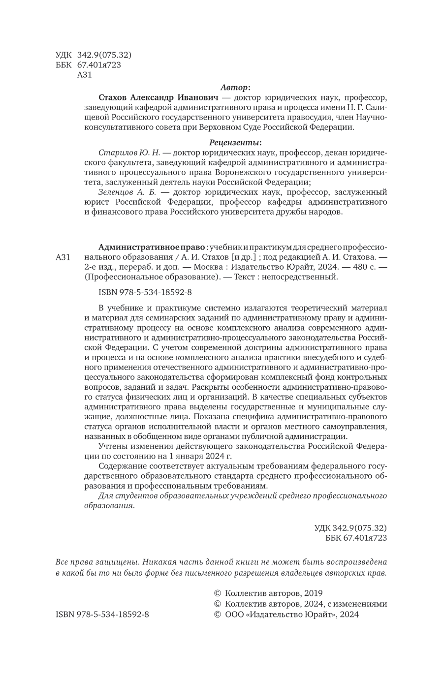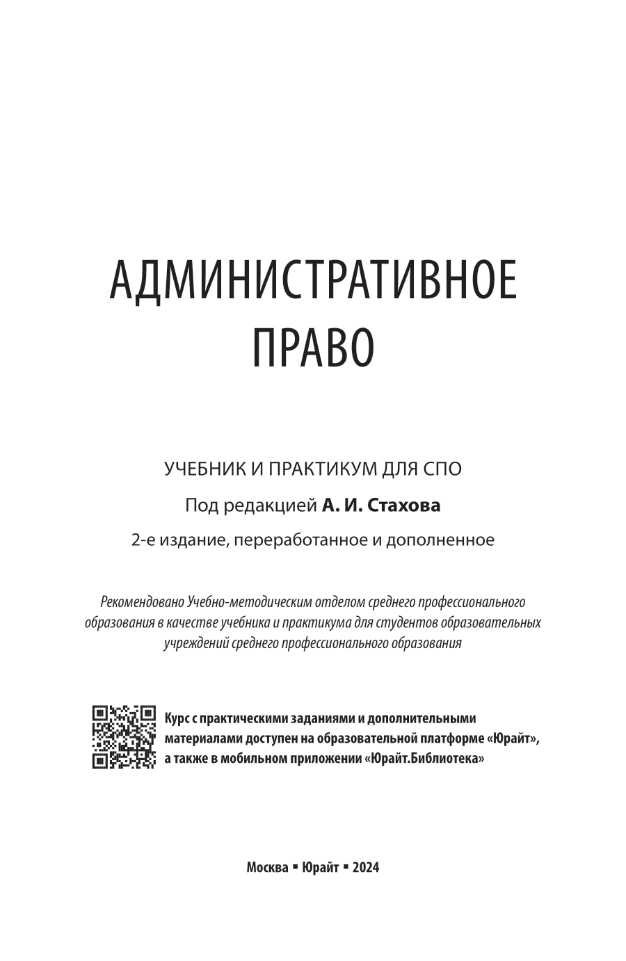 В учебнике и практикуме системно излагаются теоретический материал и материал для семинарских заданий по административному праву и административному процессу на основе комплексного анализа современного административного и административно-процессуального законодательства Российской Федерации. С учетом современной доктрины административного права и процесса и на основе комплексного анализа практики внесудебного и судебного применения отечественного административного и административно-процессуального законодательства сформирован комплексный фонд контрольных вопросов, заданий и задач. Раскрыты особенности административно-правового статуса физических лиц и организаций. В качестве специальных субъектов административного права выделены государственные и муниципальные служащие, должностные лица. Показана специфика административно-правового статуса органов исполнительной власти и органов местного самоуправления, названных в обобщенном виде органами публичной администрации. Учтены изменения действующего законодательства Российской Федерации по состоянию на 01 января 2024 г. Содержание соответствует актуальным требованиям федерального государственного образовательного стандарта среднего профессионального образования и профессиональным требованиям. Для студентов образовательных учреждений среднего профессионального образования.