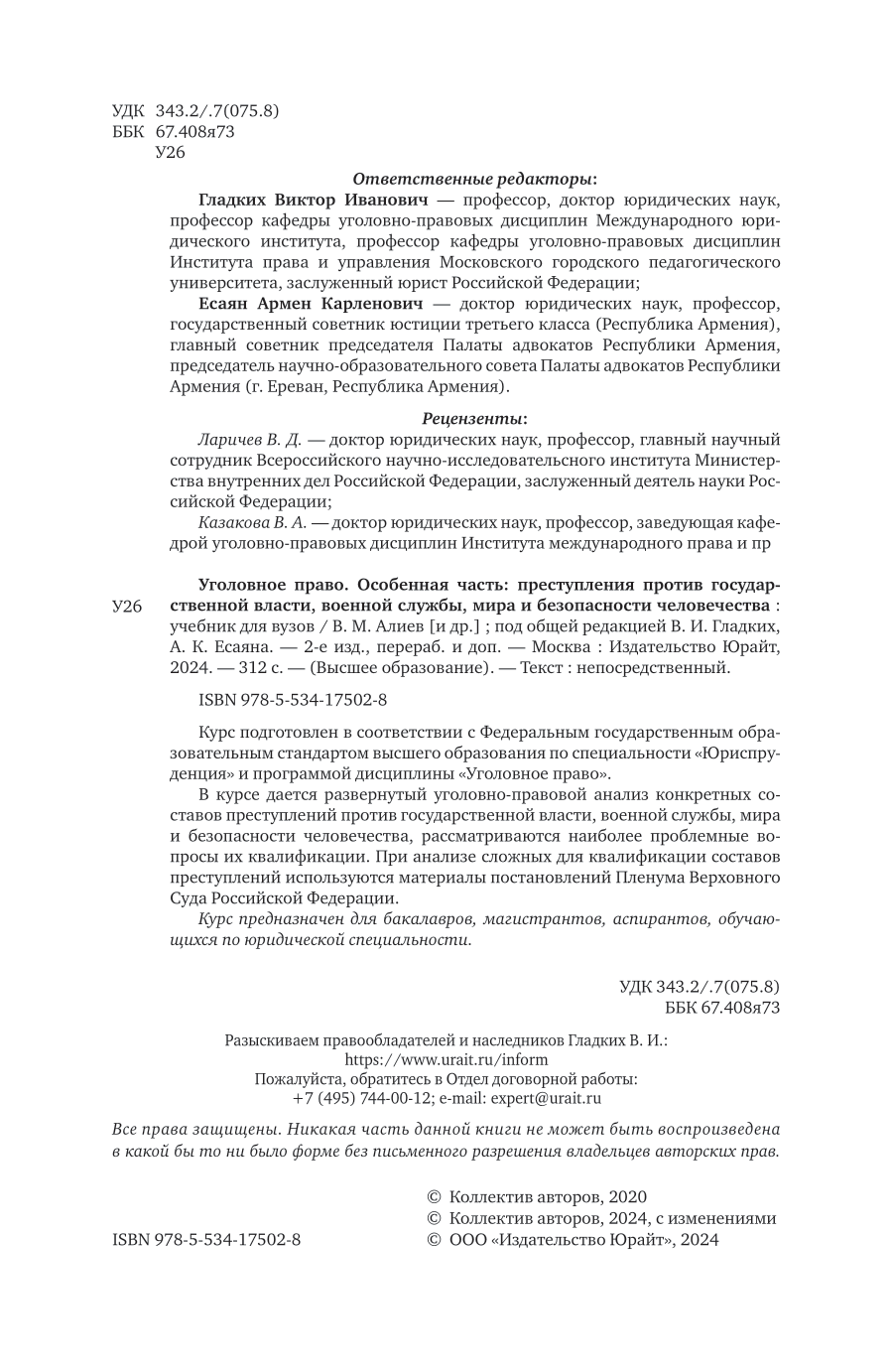 Уголовное право. Особенная часть: преступления против государственной власти военной службы мира и безопасности человечества 2-е изд. пер. и доп. Учебник для вузов (Вагиф Музафарович Алиев); ЮРАЙТ, 2024