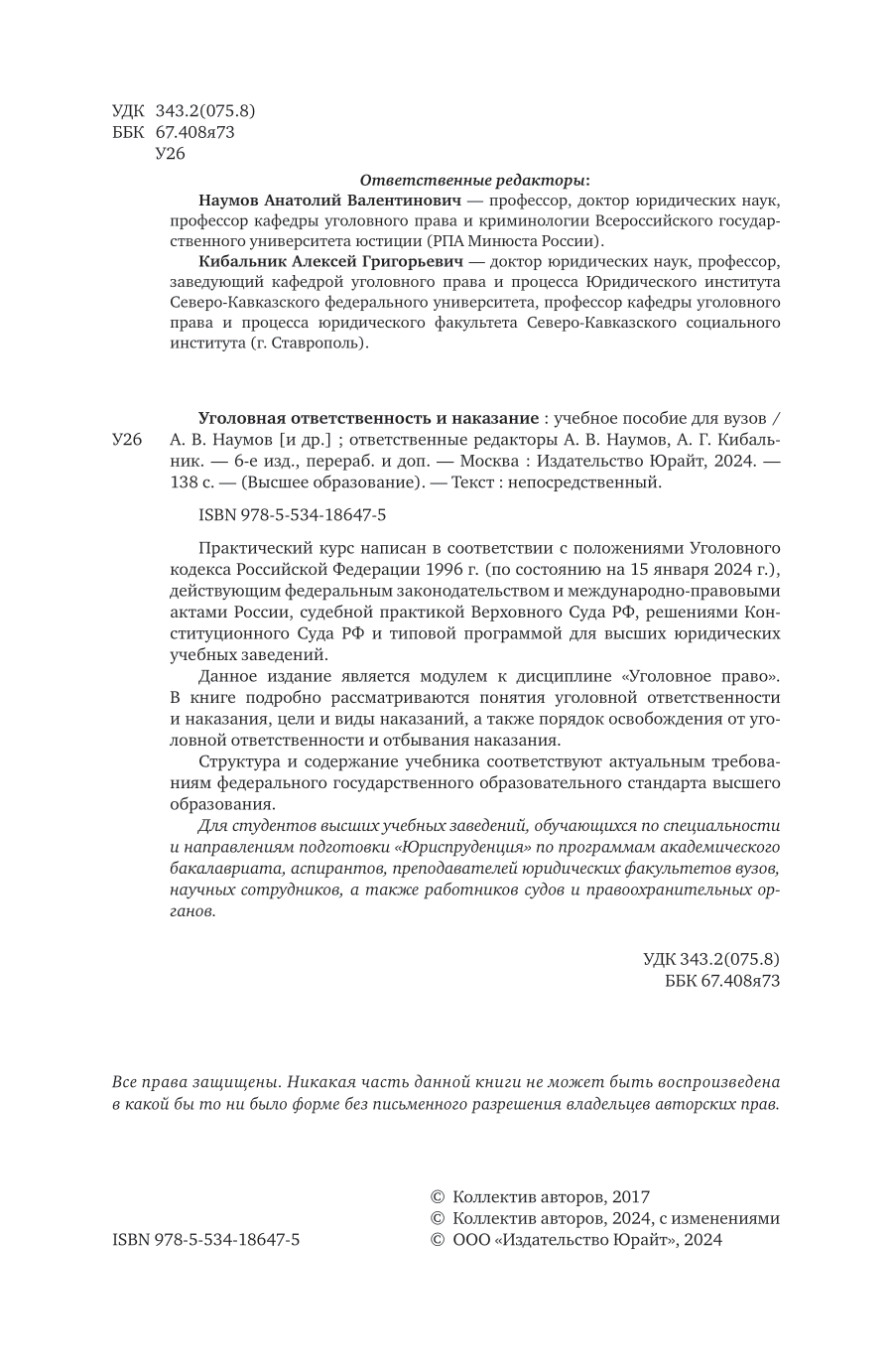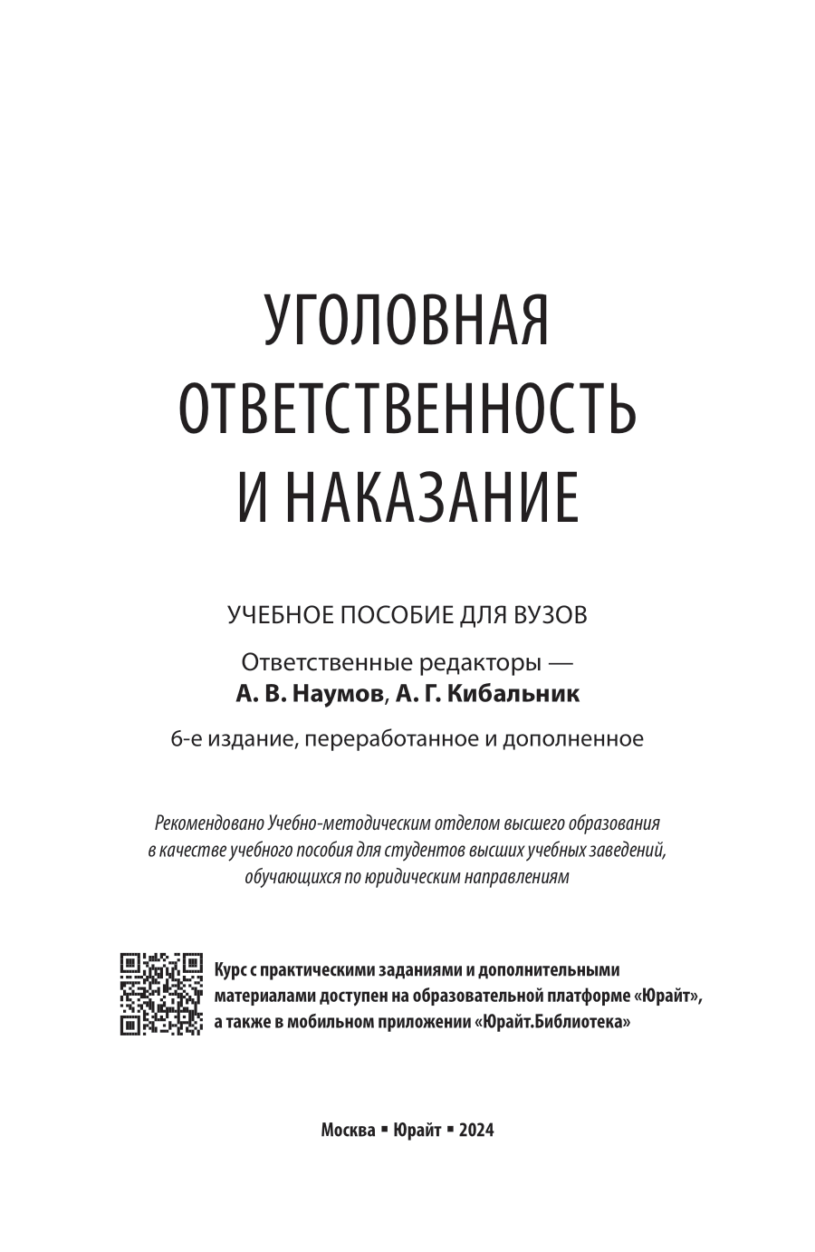 Практический курс написан в соответствии с положениями Уголовного кодекса Российской Федерации 1996 г. (по состоянию на 15 января 2024 г.), действующим федеральным законодательством и международно-правовыми актами России, судебной практикой Верховного Суда РФ, решениями Конституционного Суда РФ и типовой программой для высших юридических учебных заведений. Данное издание является модулем к дисциплине «Уголовное право». В книге подробно рассматриваются понятия уголовной ответственности и наказания, цели и виды наказаний, а также порядок освобождения от уголовной ответственности и отбывания наказания. Структура и содержание учебника соответствуют актуальным требованиям Федерального государственного образовательного стандарта высшего образования. Для студентов высших учебных заведений, обучающихся по специальности и направлениям подготовки «Юриспруденция» по программам академического бакалавриата, аспирантов, преподавателей юридических факультетов вузов, научных сотрудников, а также работников судов и правоохранительных органов.