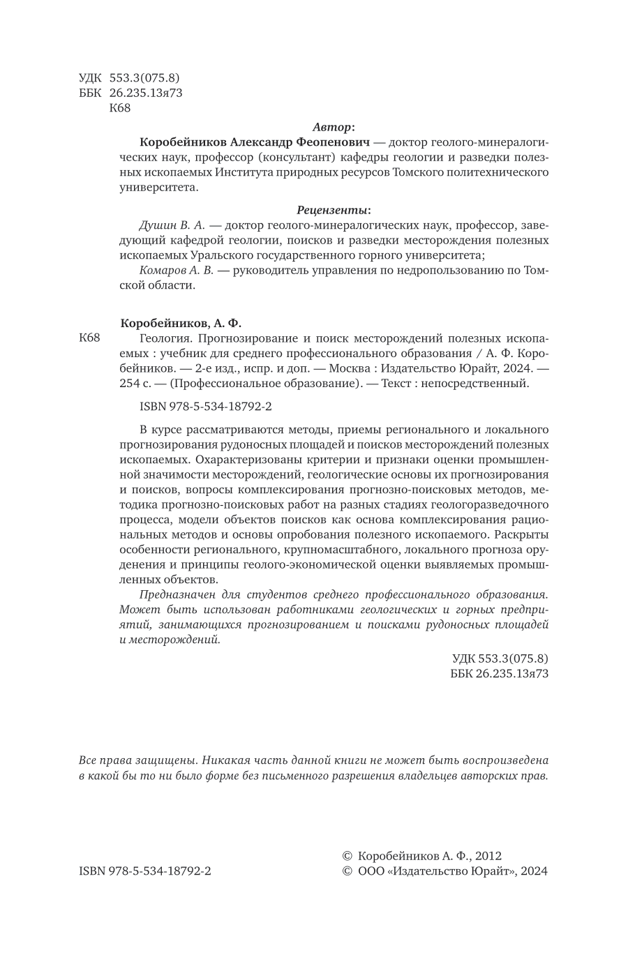Сервис сравнения цен СкидкаГИД предлагает сравнить цены на товар «Книга: Геология. Прогнозирование и поиск месторождений полезных ископаемых 2-е изд. испр. и доп. Учебник для СПО (Александр Феопенович Коробейников); ЮРАЙТ, 2024»