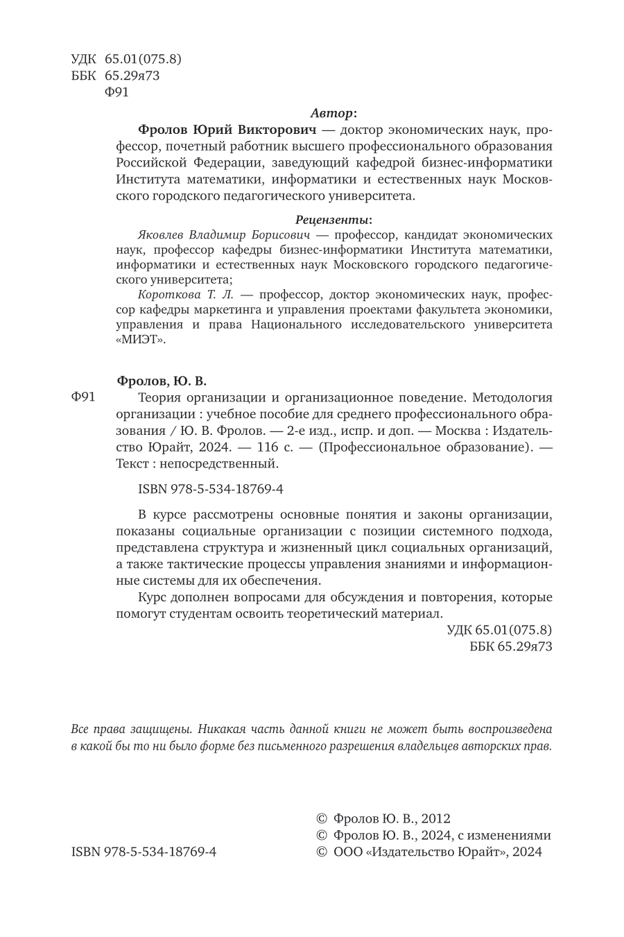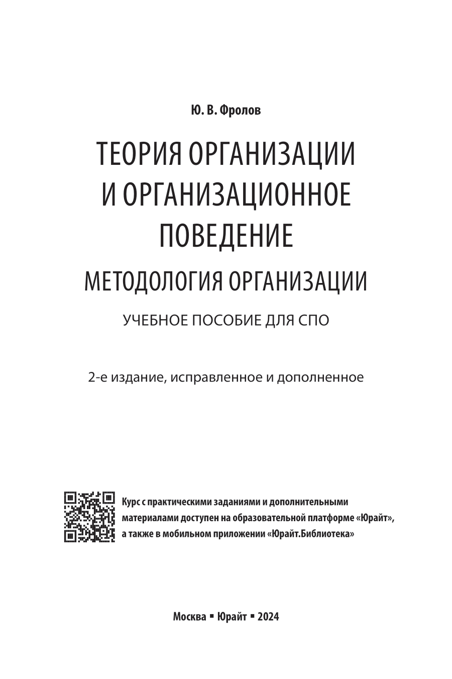 Теория организации и организационное поведение. Методология организации 2-е изд. испр. и доп. Учебное пособие для СПО (Юрий Викторович Фролов); ЮРАЙТ, 2024