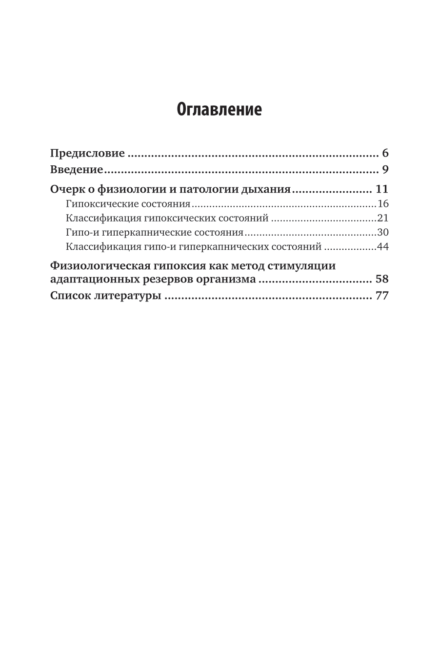 В курсе представлены краткий очерк по физиологии и патологии дыхания, новые классификации гипоксических, гипо- и гиперкапнических состояний. Даны практические рекомендации по использованию приоритетного для России метода гипоксической стимуляции организма при терапии широкого круга заболеваний, при проведении радио- и химиотерапии. Соответствует актуальным требованиям федерального государственного образовательного стандарта высшего образования. Для студентов высших учебных заведений, обучающихся по медицинским направлениям, а также аспирантов и врачей, использующих гипокситерапию и гипоксические тренировки в спорте.