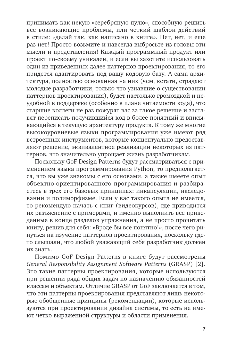 В учебном пособии рассматриваются существующие принципы разработки программных продуктов, такие как SOLID, KISS, DRY, YAGNI и чистая архитектура, общие паттерны распределения обязанностей (GRASP), а также порождающие, структурные и поведенческие паттерны проектирования GoF. Приводятся сильные и слабые стороны существующих методологий разработки программного обеспечения. Весь материал, который приводится в учебном пособии, в той или иной мере применяется на практике в продуктовых компаниях IT-сегмента. Все исходные коды рассматриваемых примеров можно скачать с репозитория автора на GitHub. Соответствует актуальным требованиям федерального государственного образовательного стандарта высшего образования. Издание адресовано студентам высших учебных заведений, обучающимся по IT-направлениям.