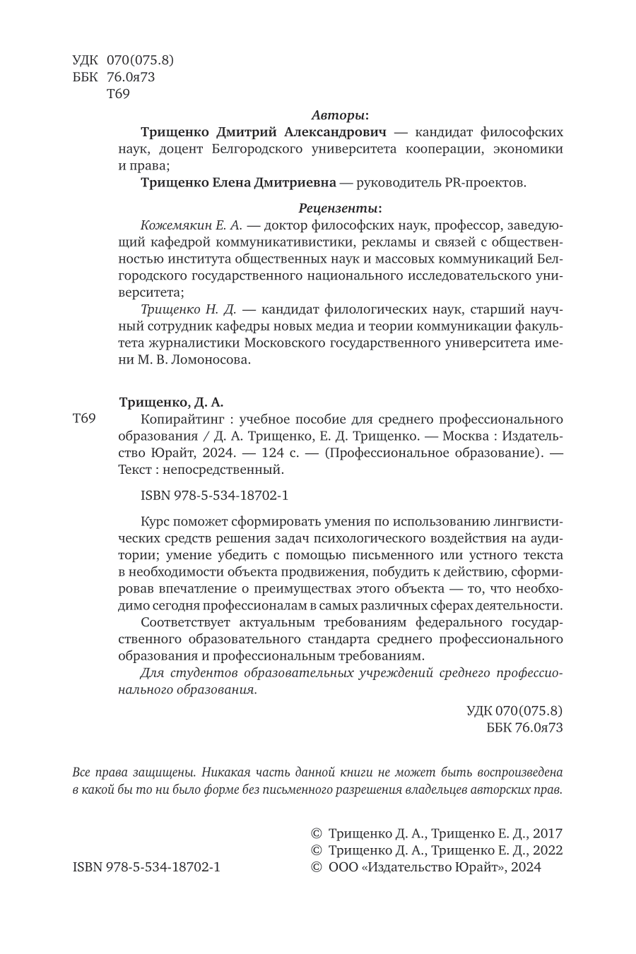 Копирайтинг. Учебное пособие для СПО (Д. А. Трищенко); ЮРАЙТ, 2024