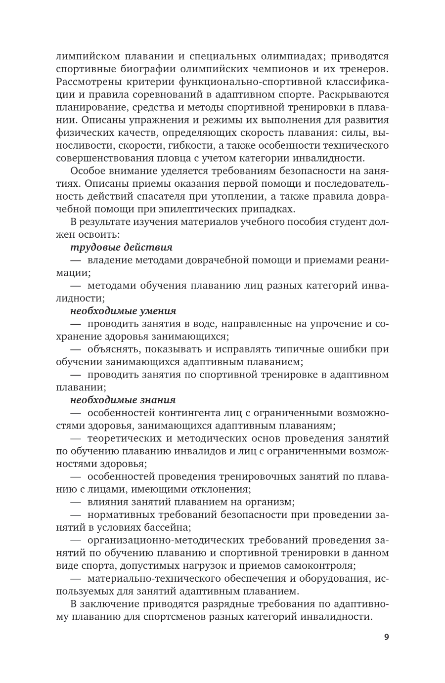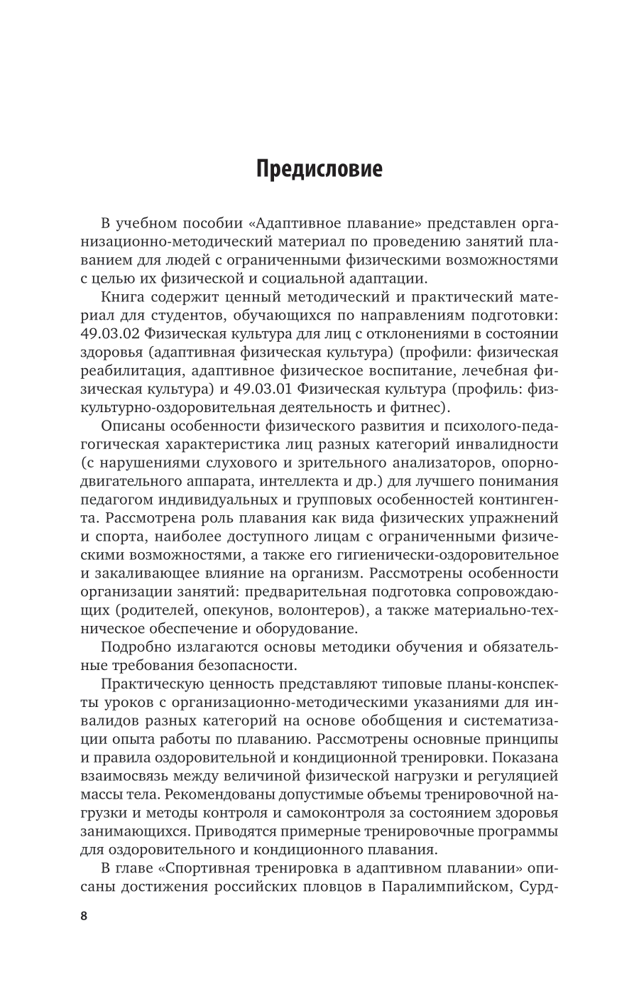 В настоящем курсе рассматривается ценность плавания в системе оздоровления и реабилитации человека. Он содержит организационно-методические материалы по проведению учебно-тренировочных занятий по плаванию для лиц с ограниченными возможностями с целью их физической и социальной адаптации. В курсе систематизирован и обобщен опыт работы отечественных и зарубежных специалистов по организации и методике проведения занятий плаванием для лиц с различными патологиями, для которых представлены специально разработанные программы обучения и начальной тренировки. Рассмотрены специфика организации и материально-техническое обеспечение занятий. Соответствует актуальным требованиям федерального государственного образовательного стандарта среднего профессионального образования и профессиональным требованиям. Для студентов образовательных учреждений среднего профессионального образования, обучающихся по направлению подготовки «Физическая культура».