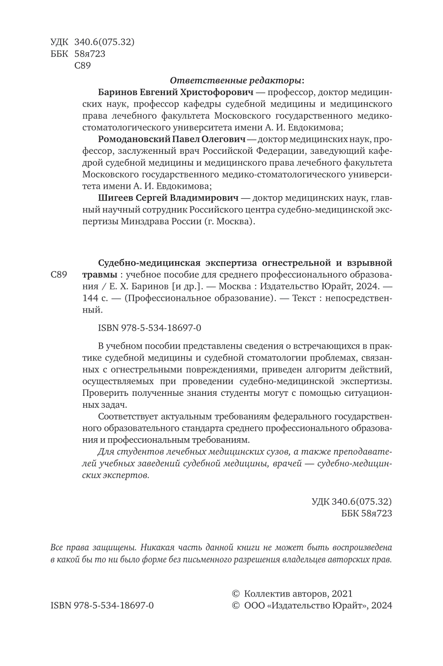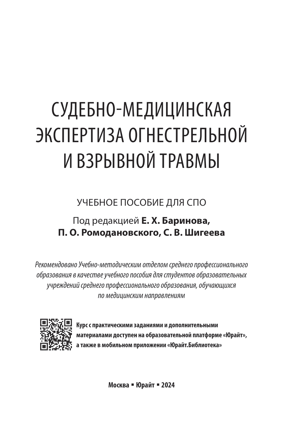 Судебно-медицинская экспертиза огнестрельной и взрывной травмы. Учебное пособие для СПО (Евгений Христофорович Баринов); ЮРАЙТ, 2024