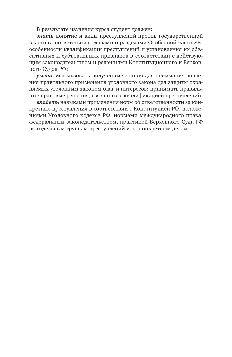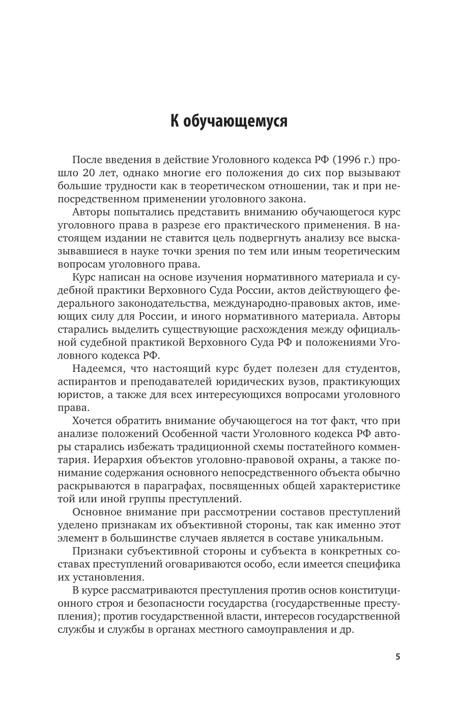 Практический курс уголовного права написан в соответствии с положениями Уголовного кодекса Российской Федерации 1996 г. (по состоянию на 18 июля 2017 г.), действующим федеральным законодательством и международно-правовыми актами России, судебной практикой Верховного Суда РФ, решениями Конституционного Суда РФ и типовой программой для высших юридических учебных заведений. Данный курс является модулем к дисциплине «Уголовное право». В курсе рассматриваются преступления против основ конституционного строя и безопасности государства (государственные преступления); против государственной власти, интересов государственной службы и службы в органах местного самоуправления и др.