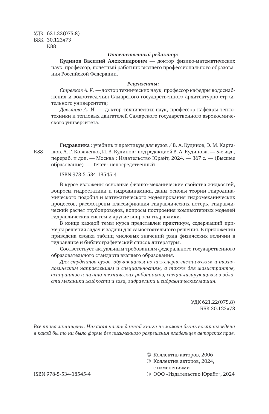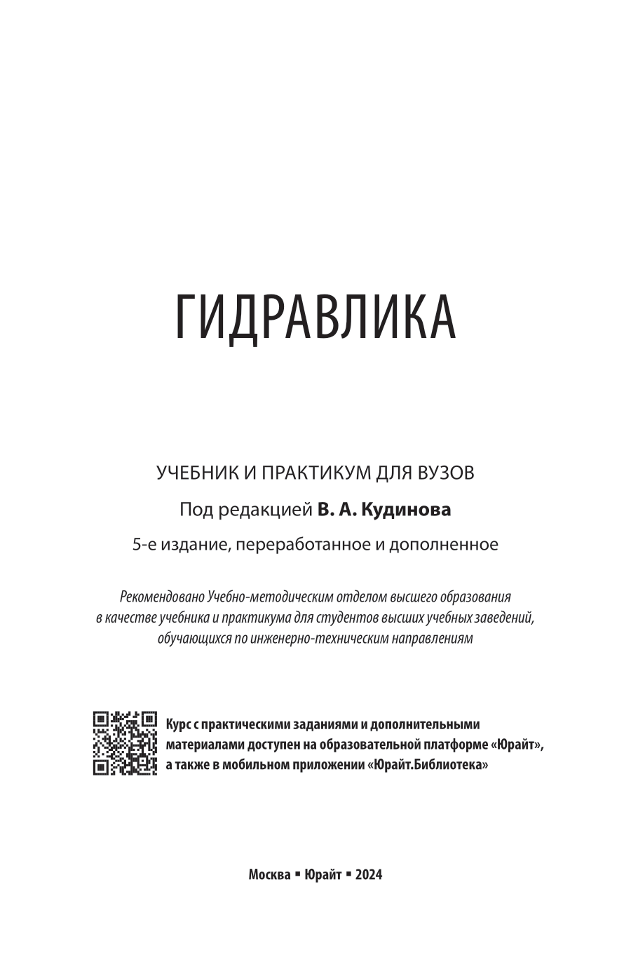 Гидравлика 5-е изд. пер. и доп. Учебник и практикум для вузов (Василий Александрович Кудинов); ЮРАЙТ, 2024