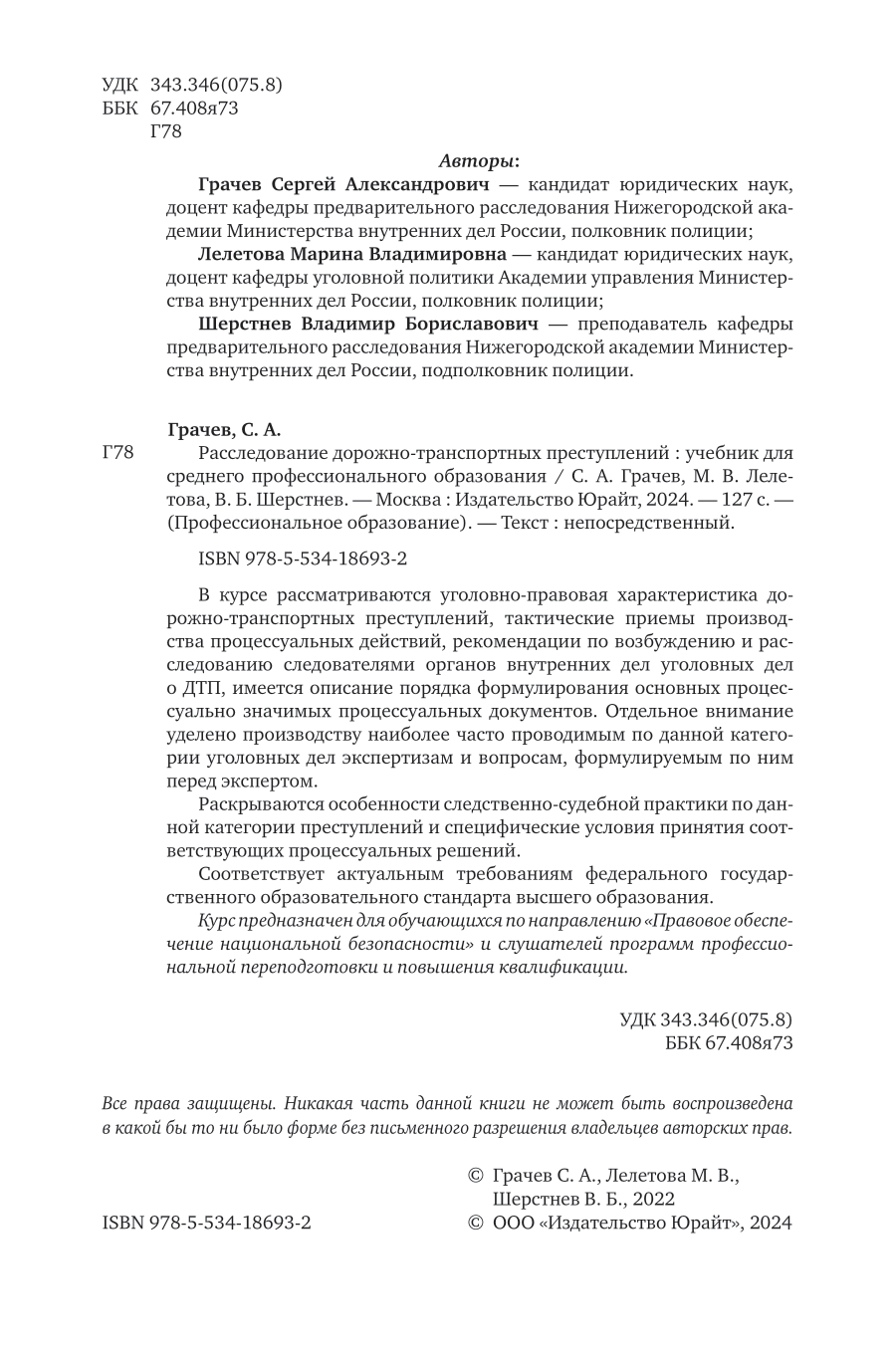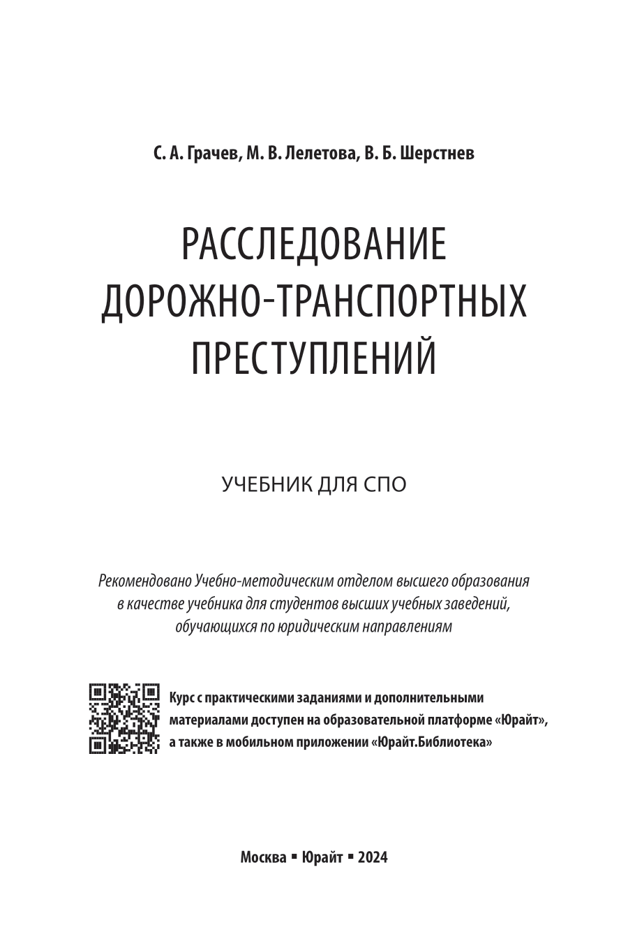 Расследование дорожно-транспортных преступлений. Учебник для СПО (Сергей Александрович Грачев); ЮРАЙТ, 2024