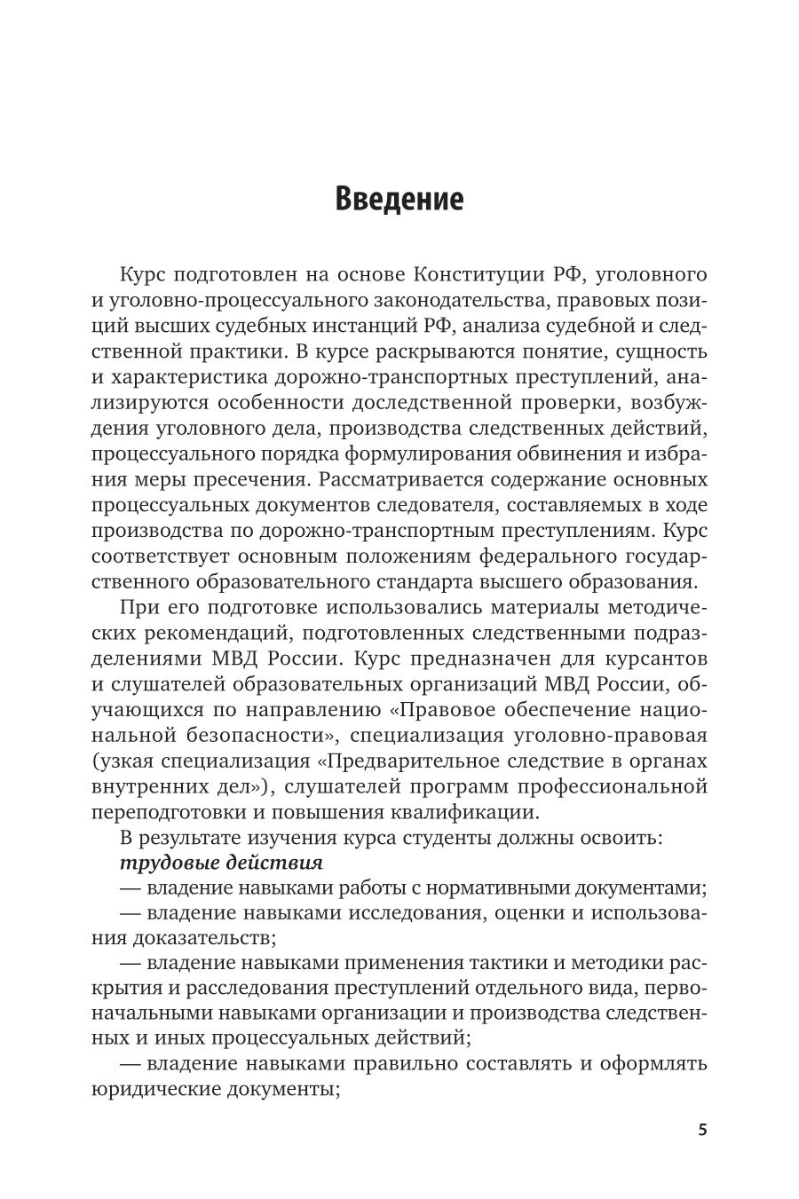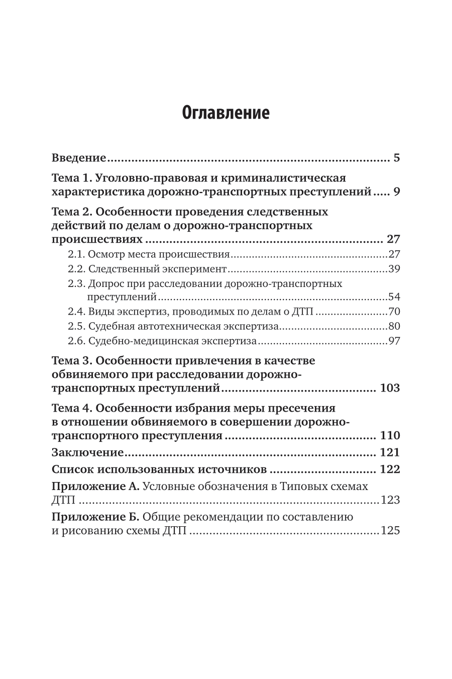 В курсе рассматриваются уголовно-правовая характеристика дорожно-транспортных преступлений, тактические приемы производства процессуальных действий, рекомендации по возбуждению и расследованию следователями органов внутренних дел уголовных дел о ДТП, имеется описание порядка формулирования основных процессуально значимых процессуальных документов. Отдельное внимание уделено производству наиболее часто проводимым по данной категории уголовных дел экспертизам и вопросам, формулируемым по ним перед экспертом. Раскрываются особенности следственно-судебной практики по данной категории преступлений и специфические условия принятия соответствующих процессуальных решений. Соответствует актуальным требованиям федерального государственного образовательного стандарта высшего образования. Курс предназначен для обучающихся по направлению «Правовое обеспечение национальной безопасности» и слушателей программ профессиональной переподготовки и повышения квалификации.