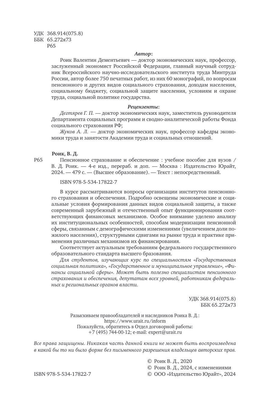 Пенсионное страхование и обеспечение 4-е изд. пер. и доп. Учебное пособие для вузов (Валентин Дементьевич Роик); ЮРАЙТ, 2024