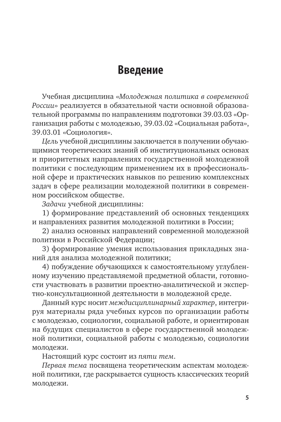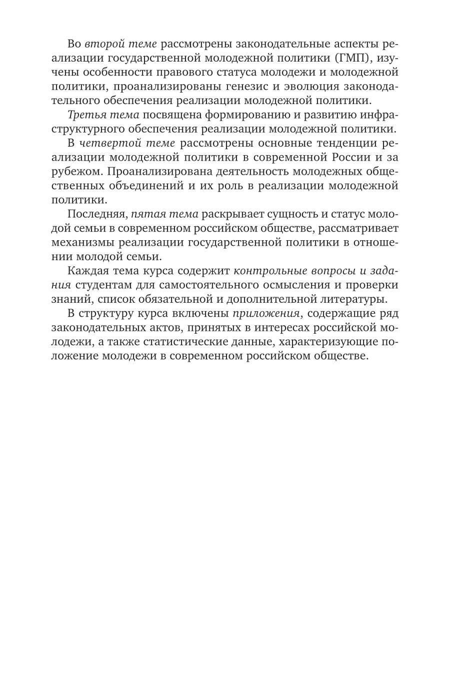 Курс посвящен вопросам развития молодежи и реализации молодежной политики в России и за рубежом. В рамках курса рассматриваются теоретические, законодательные, инфраструктурные аспекты молодежной политики, а также основные направления современной молодежной политики. Материалы курса включают контрольные вопросы и задания к темам, а также список литературы, отдельные законодательные и нормативные акты, регулирующие деятельность молодежной политики в современной России. Курс соответствует актуальным требованиям федерального государственного образовательного стандарта высшего образования и предназначен для студентов, обучающихся по направлениям подготовки социогуманитарного профиля.