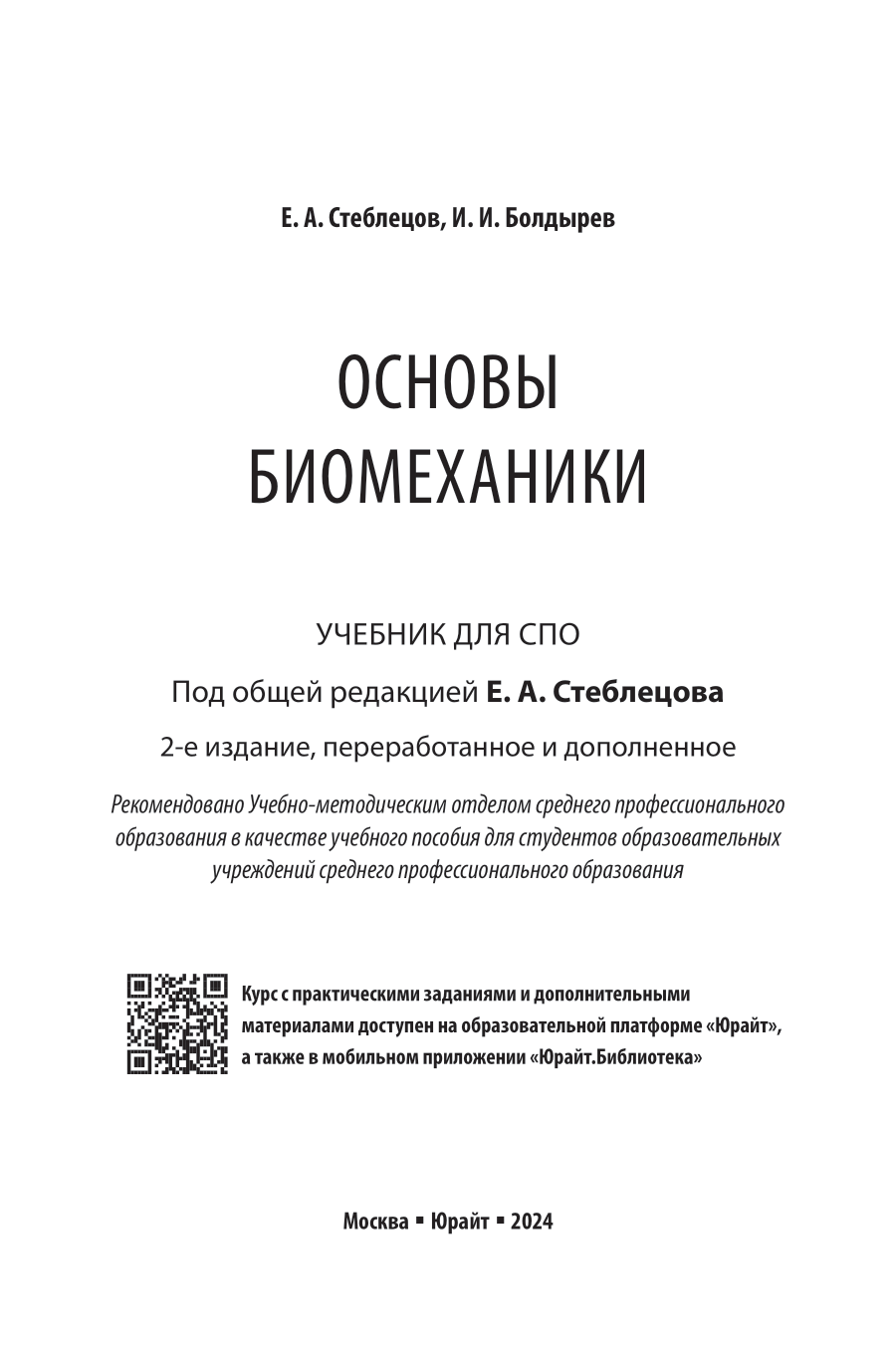 Основы биомеханики 2-е изд. пер. и доп. Учебник для СПО (Е. А. Стеблецов); ЮРАЙТ, 2024