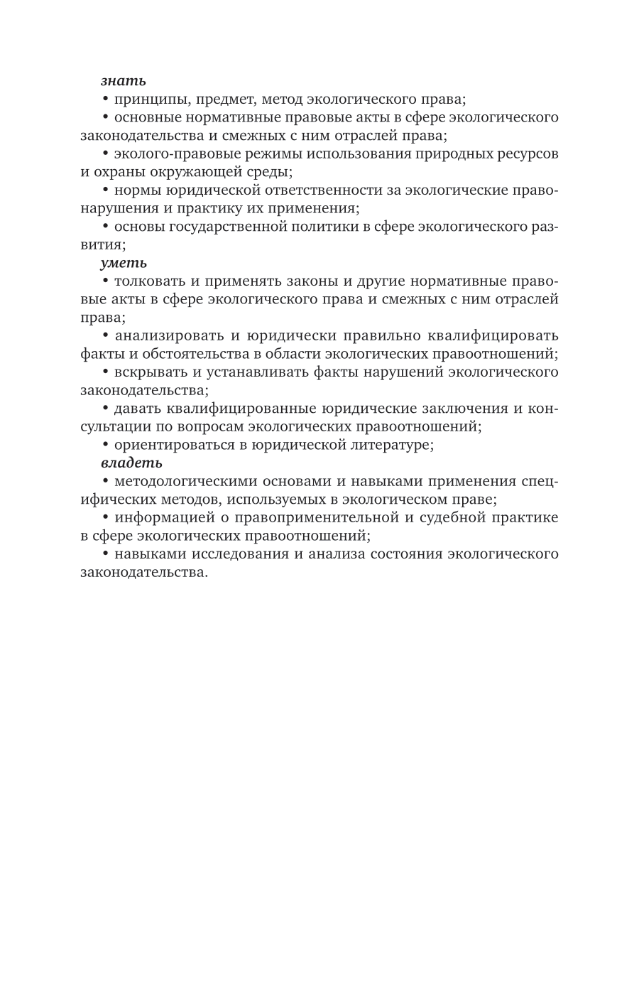 Главная цель настоящего курса - помочь студентам, обучающимся по юридическим направлениям и специальностям, овладеть знаниями в области экологического права. В курсе изложены особенности экологических правоотношений, вопросы государственного управления в сфере использования и охраны окружающей среды, экологические права и обязанности граждан Российской Федерации, эколого-правовой режим природных объектов и комплексов, составляющих экологическую систему России, а также вопросы международного экологического права. Несомненными достоинствами данного курса являются четкость формулировок и методически выверенное изложение сложного материала. Проверить полученные теоретические знания студенты могут с помощью контрольных вопросов и заданий, представленных к каждой теме курса. Настоящий курс также будет полезен практическим работникам, специализирующимся в области экологического права и охраны окружающей среды, сотрудникам природоохранных органов, законодательных и исполнительных органов власти, и всем интересующимся вопросами экологического права и охраны окружающей среды. Содержание курса соответствует актуальным требованиям федерального государственного образовательного стандарта высшего образования. Для студентов, аспирантов, преподавателей юридических вузов и факультетов, а также для научных сотрудников, специализирующихся в области экологического права и охраны окружающей среды, работников природоохранных и равоохранительных органов, законодательных и исполнительных органов власти, органов местного самоуправления и всех лиц, интересующихся экологическими проблемами России.