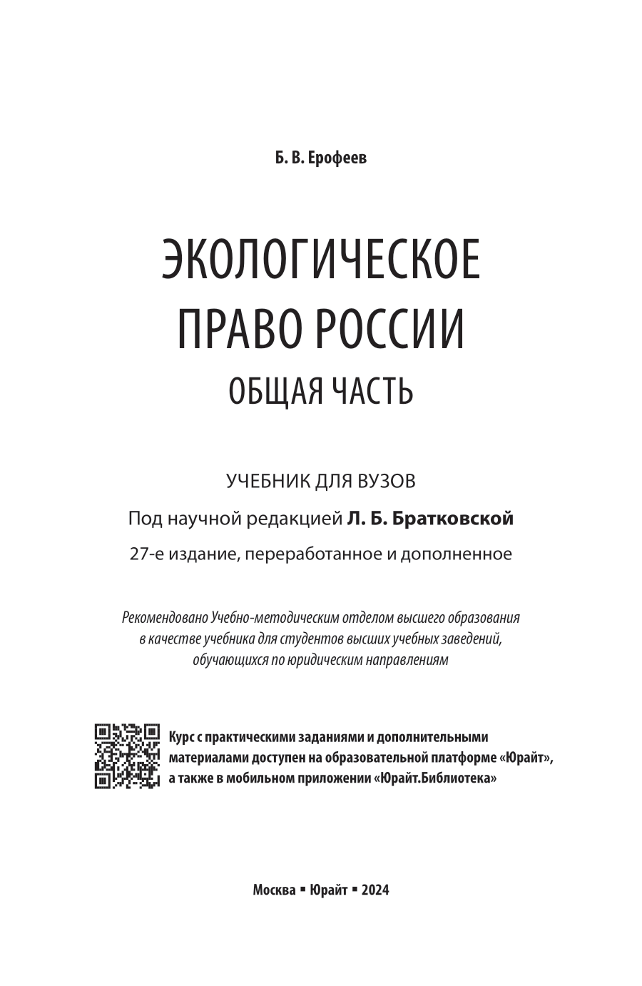 Экологическое право России. Общая часть 27-е изд. пер. и доп. Учебник для вузов (Борис Владимирович Ерофеев); ЮРАЙТ, 2024