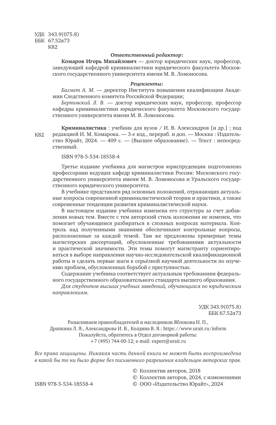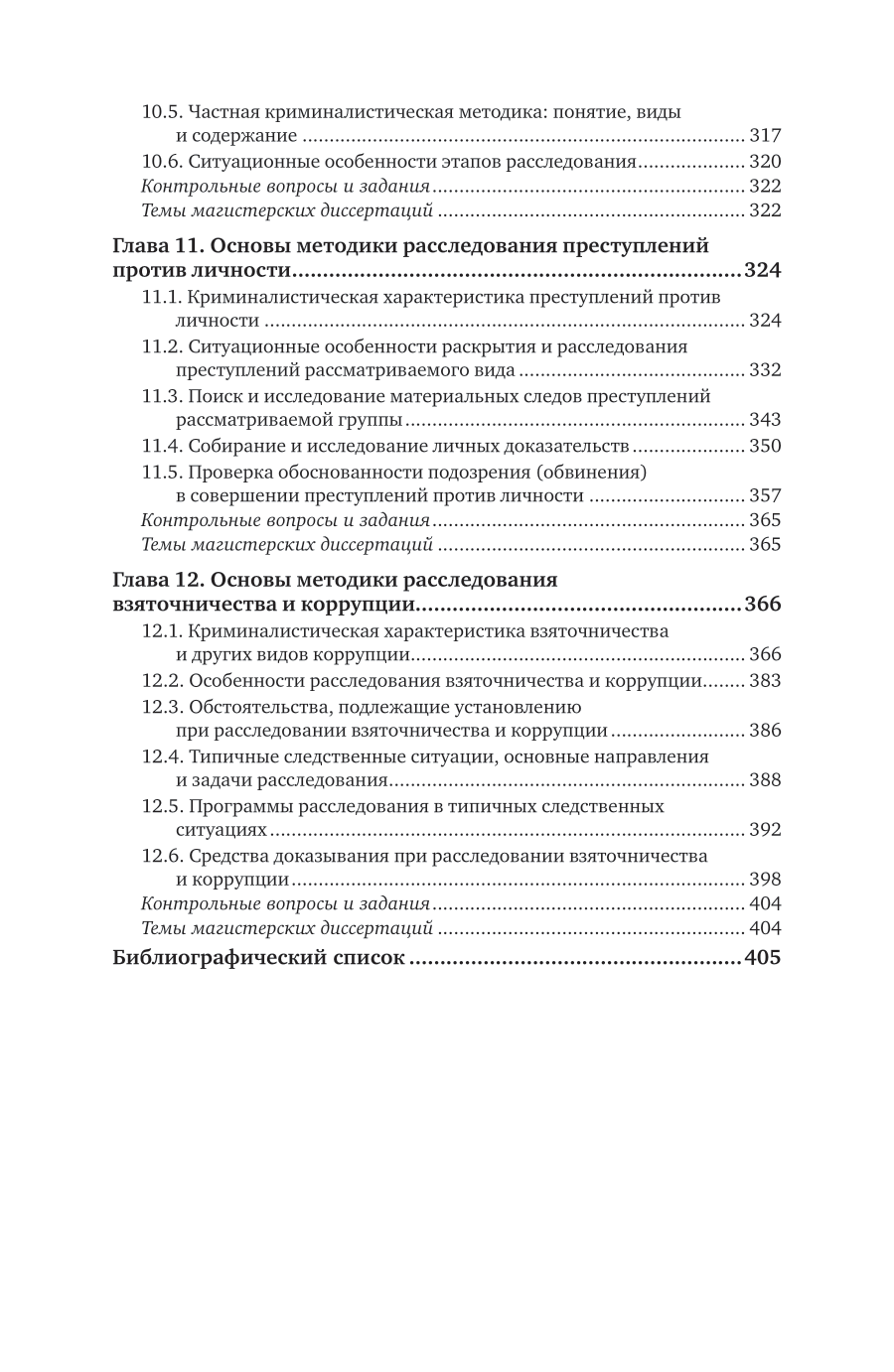 Третье издание учебника для магистров юриспруденции подготовлено профессорами ведущих кафедр криминалистики России: Московского государственного университета имени М. В. Ломоносова и Уральского государственного юридического университета. В учебнике представлен ряд основных положений, отражающих актуальные вопросы современной криминалистической теории и практики, а также современные тенденции развития криминалистической науки. В настоящем издании учебника изменена его структура за счет добавления новых тем. Вместе с тем авторский стиль изложения не изменен, что помогает обучающимся разбираться в сложных вопросах материала. Контроль над полученными знаниями обеспечивают контрольные вопросы, расположенные за каждой темой. Там же предложены примерные темы магистерских диссертаций, обусловленные требованиями актуальности и практической значимости. Эти темы помогут магистранту сориентироваться в выборе направления научно-исследовательской квалификационной работы и сделать первые шаги к серьезной научной деятельности по изучению проблем, обусловленных борьбой с преступностью. Содержание учебника соответствует актуальным требованиям Федерального государственного образовательного стандарта высшего образования. Для студентов высших учебных заведений, обучающихся по юридическим направлениям.