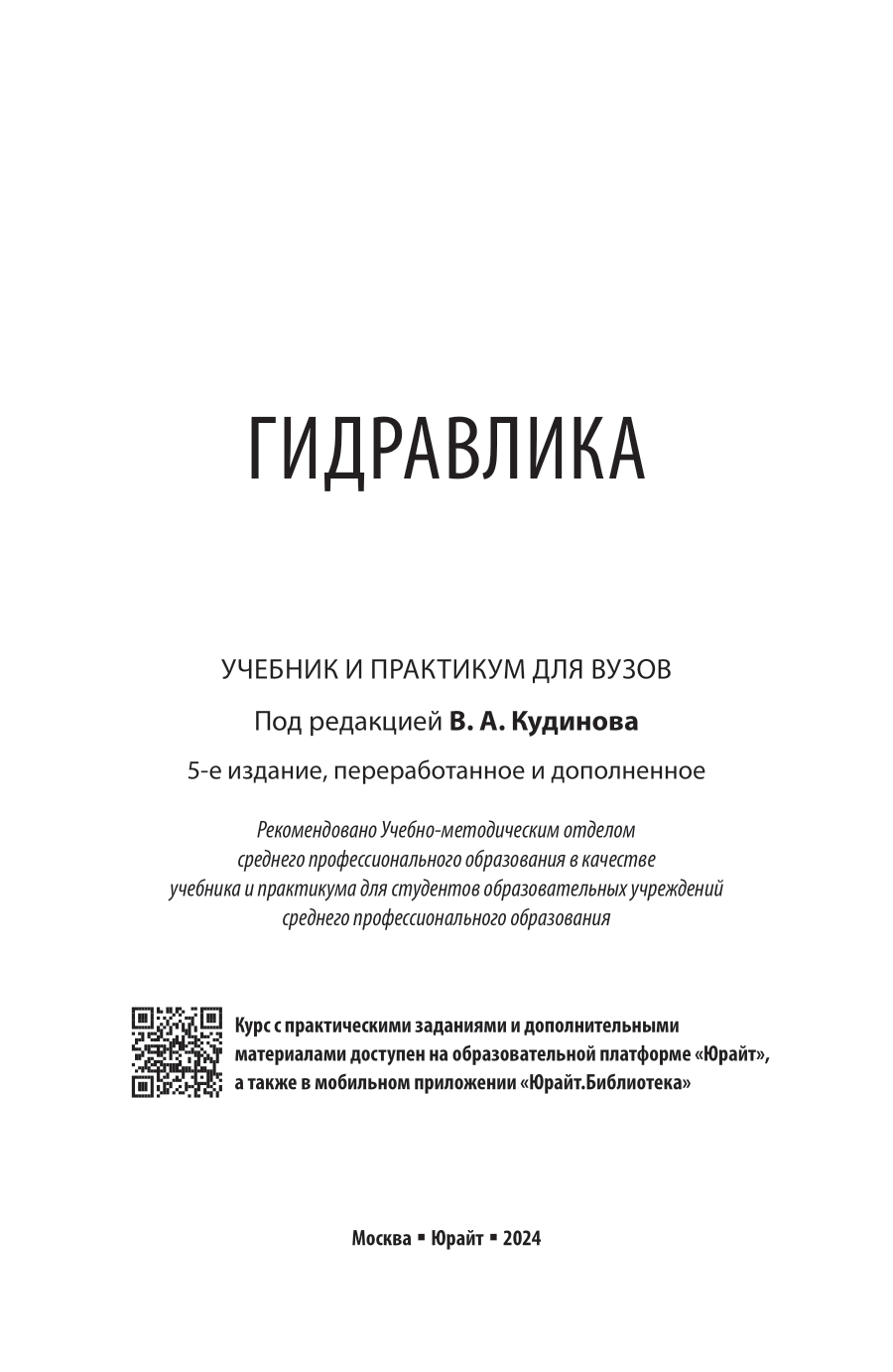 Гидравлика 5-е изд. пер. и доп. Учебник и практикум для СПО (Василий Александрович Кудинов); ЮРАЙТ, 2024