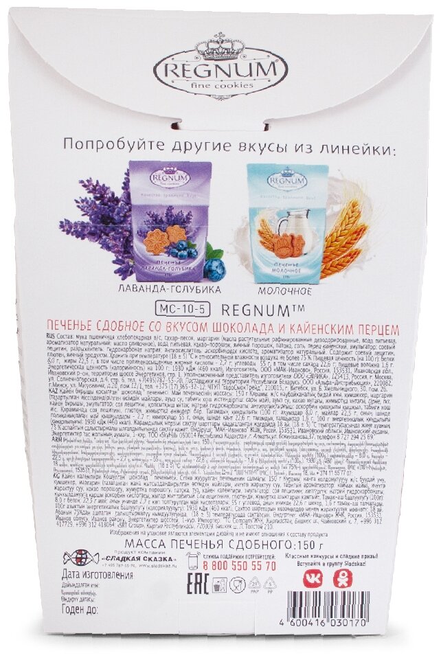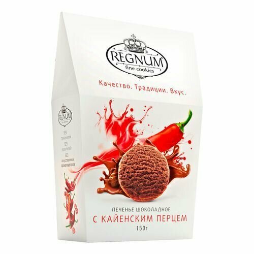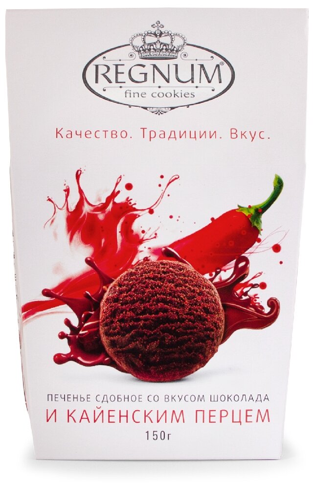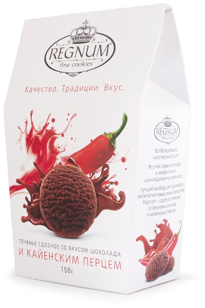 Хотите попробовать что-нибудь новое и ни на что не похожее? Группа компаний «Сладкая сказка» представляет вам печенье с уникальной рецептурой, не имеющей аналогов на российском рынке — Regnum со вкусом шоколада и кайенским перцем. Любителей изысканных рецептов приятно удивит возбуждающий и чувственный дуэт жгучей пряности перца и невероятного шоколадного послевкусия. Печенье производится на собственной российской фабрике без трансжиров, красителей и искусственных ароматизаторов. Продукт упакован в стильную премиальную коробку белого цвета весом 150 грамм. На задней части упаковки размещено изображение других вкусов печенья из линейки с оригинальными вкусами. Печенье Regnum — это высокое качество, семейные традиции и изысканный вкус.