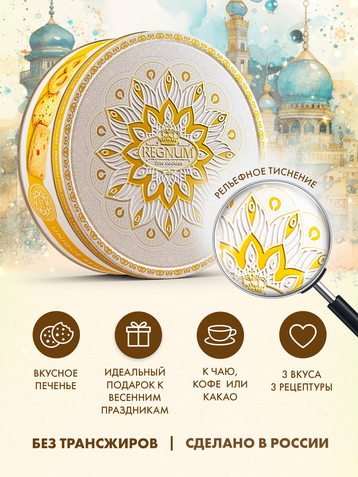 Всё больше людей переходит на здоровое питание, к которому также относят продукты, произведённые со знаком «Халяль». Международная система Халяль — это система контроля качества, строгая к генно-модифицированным продуктам и пищевым добавкам. Попробуйте новинку со знаком «Халяль» под премиальным брендом, выпущенную в жестяной подарочной банке — Regnum «Восточные узоры» от группы компаний «Сладкая сказка». Классическое сдобное печенье в сахарной обсыпке гармонично дополняется печеньем с вишней и цукатами. Цукаты придают ему ненавязчивые ноты восточного колорита. Рецептура с вишней запоминается кисло-сладкими акцентами и насыщенным ароматом, навевающим мысли о чаепитии в вишнёвом саду. Печенье производится на собственной российской фабрике без использования трансжиров, красителей и искусственных ароматизаторов. Банка Regnum «Восточные узоры» станет прекрасным подарком на любой праздник и разнообразит семейное чаепитие уникальными вкусами печенья.