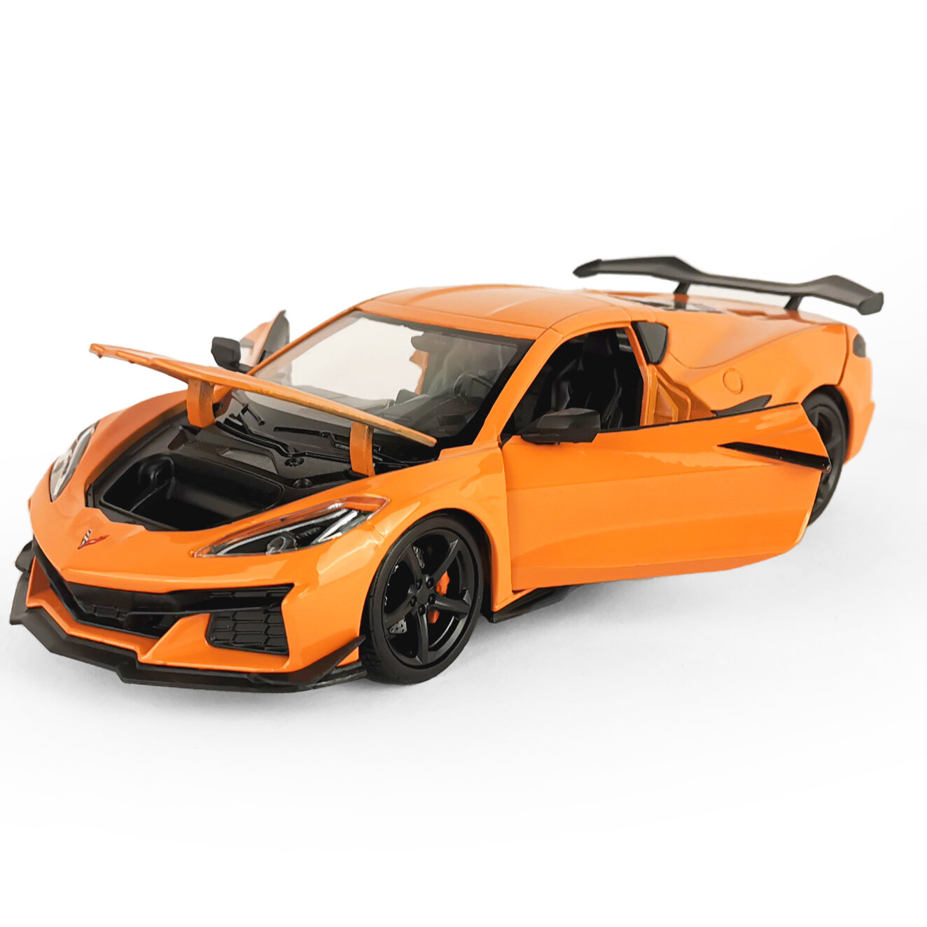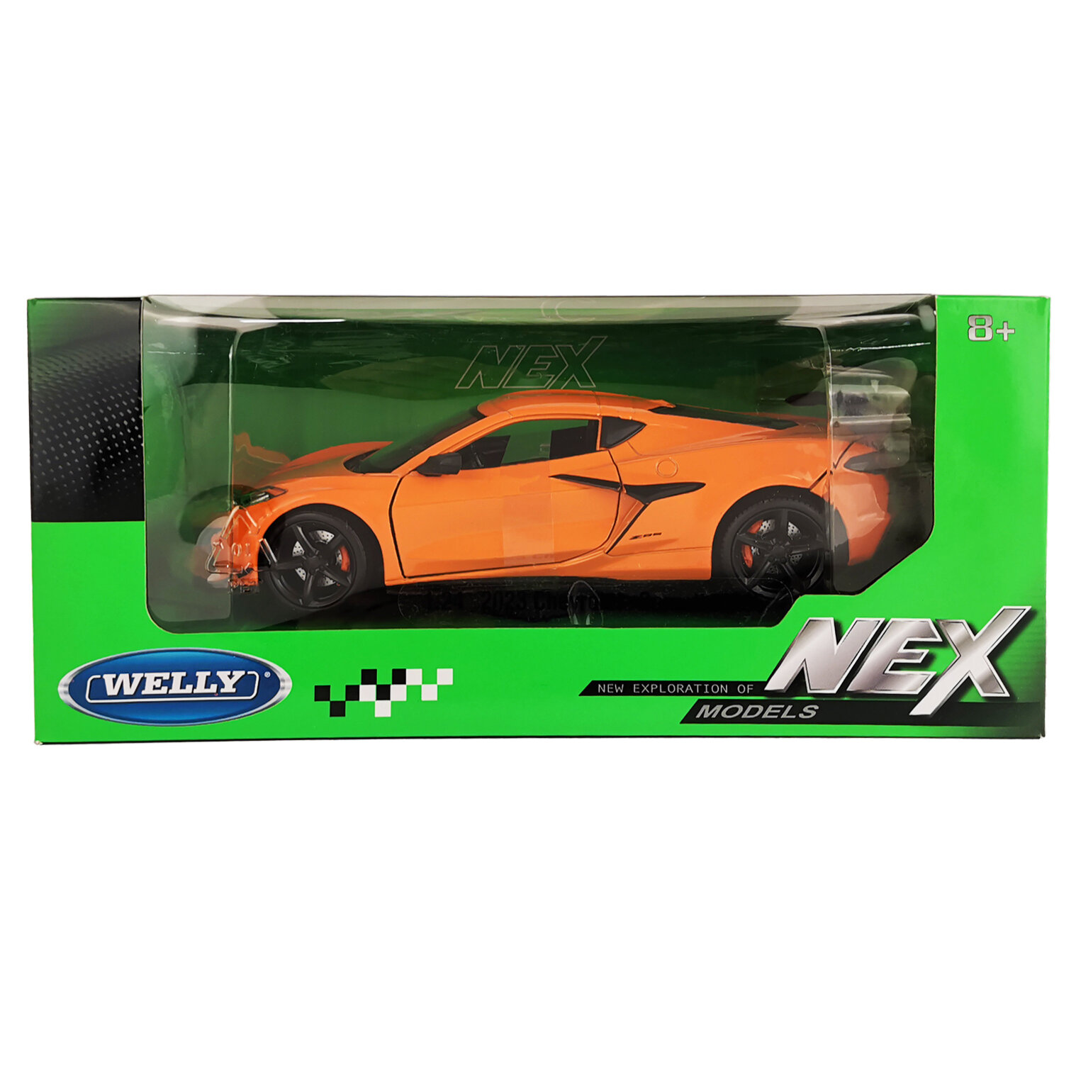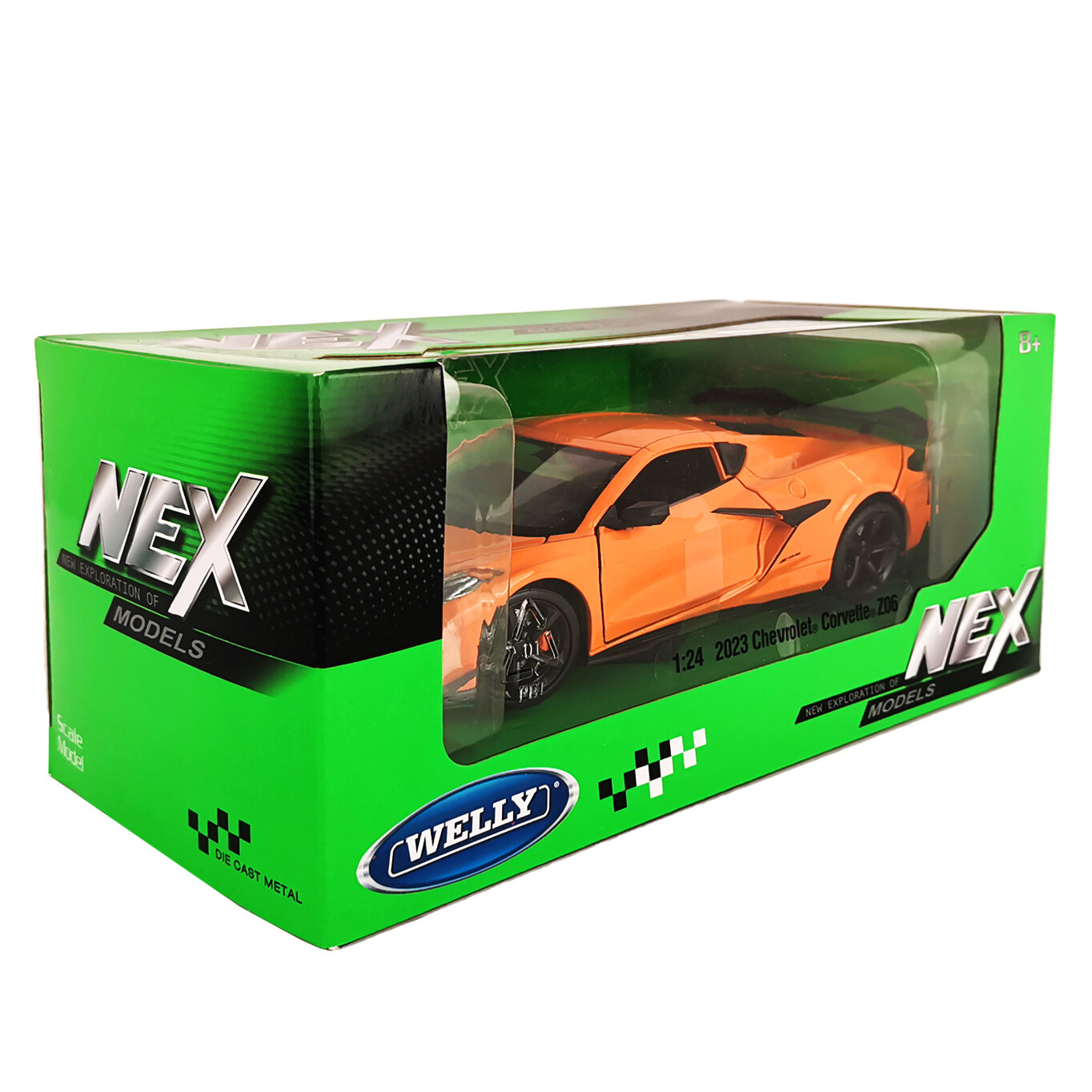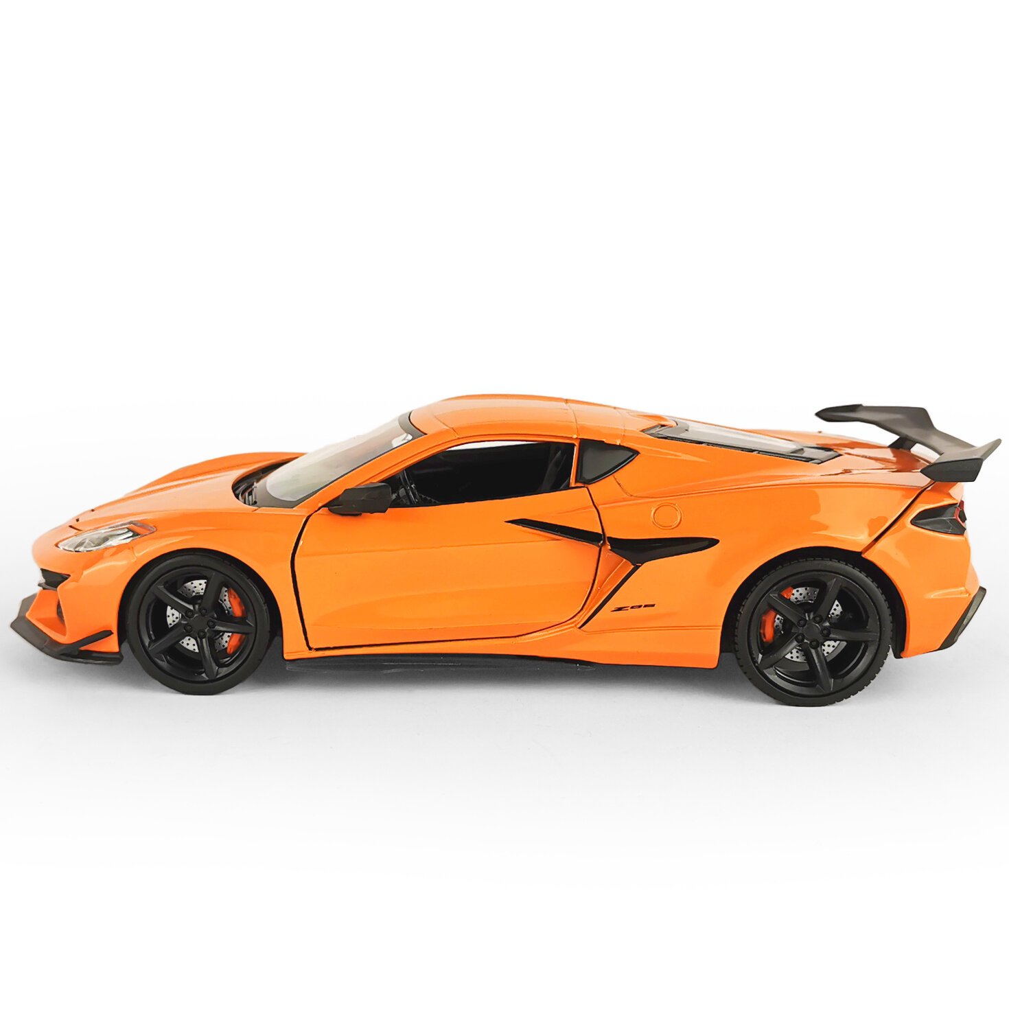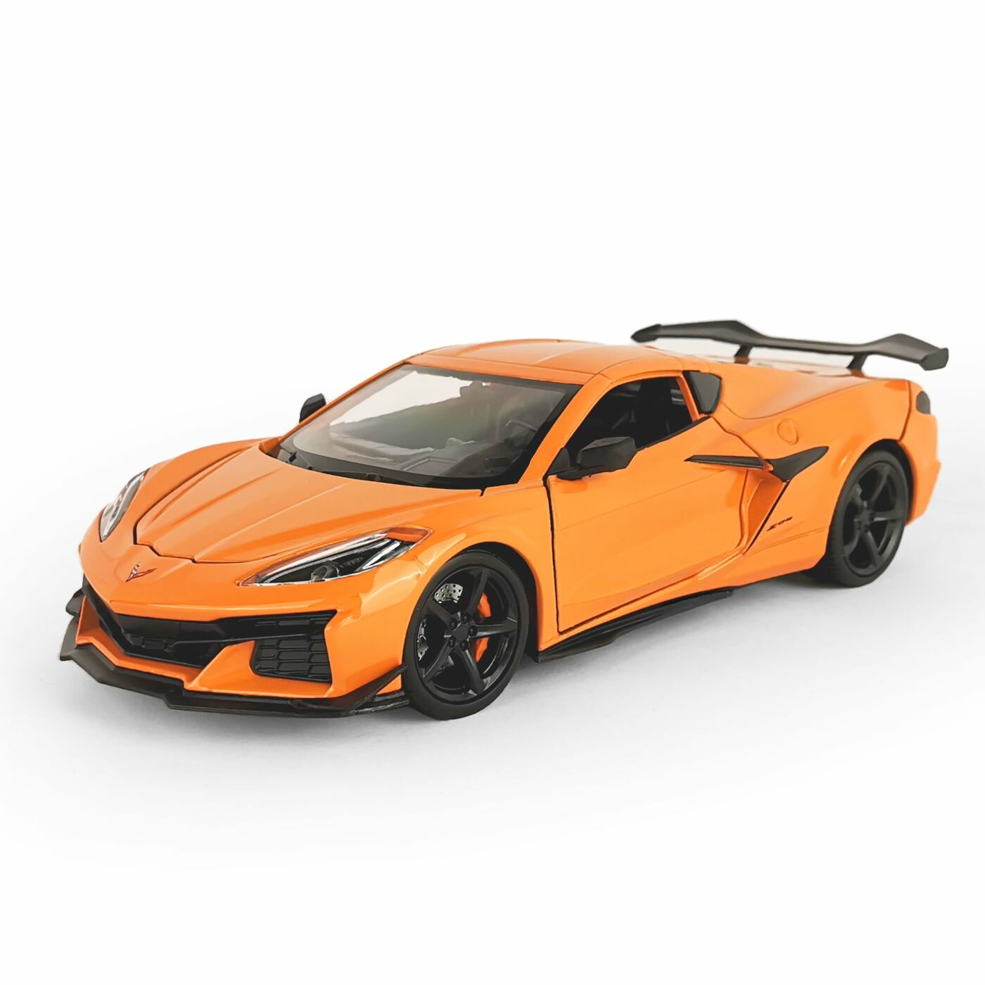 Коллекционная лицензионная машинка WELLY в масштабе 1:24, модель Chevrolet Corvette Z06, оранжевый. Выполнена из металла с элементами пластика. У модели открываются передние двери, капот и поворачиваются передние колеса.