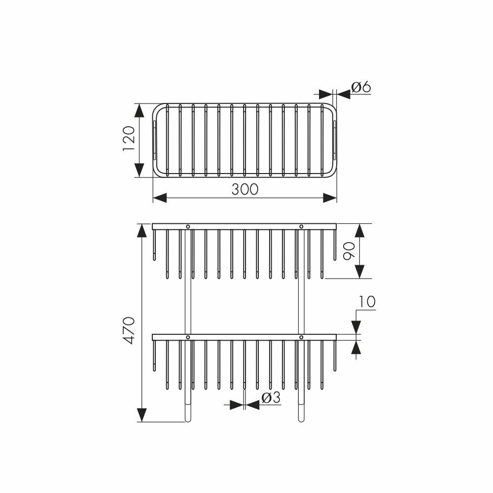 Полка двойная настенная прямоугольная KAISER с двумя крючками из нержавеющей стали, 300х120х470 мм, хром.