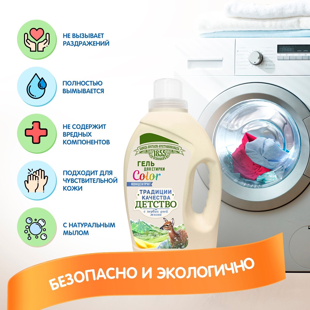 Гель для стирки ЗБК Традиции качества Детство. Цветные вещи не потеряют сочности красок. Бережно отстирывает, предупреждает смешивание красок во время стирки. Идеален для стирки детской одежды и одежды людей с чувствительной кожей.