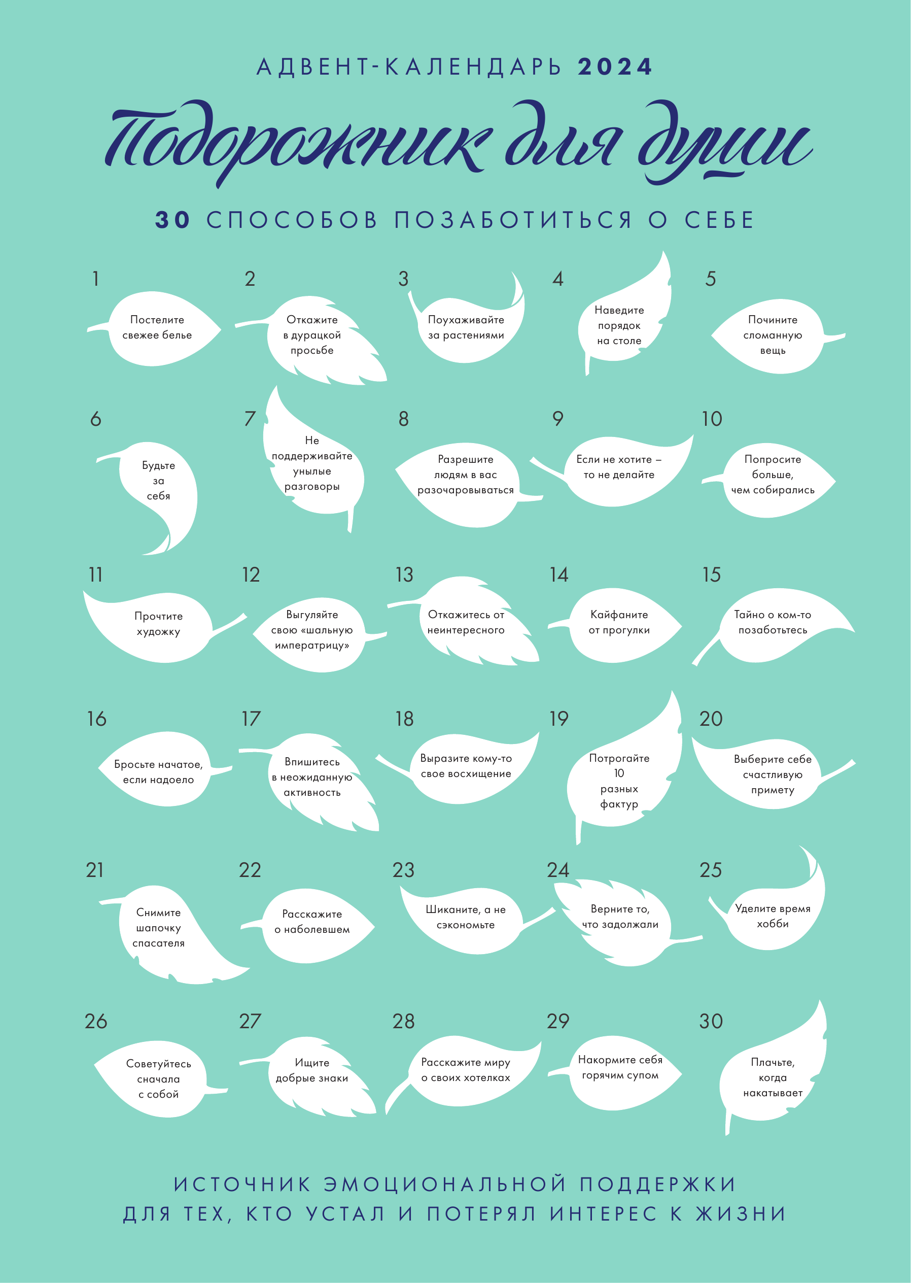 Адвент-календарь на 2024 год по мотивам бестселлера Ольги Примаченко «Всё закончится, а ты нет».Источник эмоциональной поддержки для тех, кто устал и потерял интерес к жизни.Стерев защитный слой «подорожника», вы узнаете, что можно сделать прямо сейчас (или делать в ближайшие месяцы), чтобы уменьшить тревожное напряжение и переключить внимание на простые, понятные и эффективные действия.Это не челлендж и не марафон. Не спешите, открывайте по одному «подорожнику» в несколько дней или даже неделю. А то и вовсе — только тогда, когда чувствуете, что прижало.Проверяйте предлагаемые варианты на практике и забирайте в свою копилку инструментов те, что сработали лучше всего. Пусть они станут «правилами бережного обращения с собой», на которые вы всегда сможете опереться.Трактуйте задания максимально широко: вот что первое придет на ум, то и делайте. Не обязательно выполнять дословно — вдохновляйтесь заданным направлением, слушайте себя и подсказки тела.