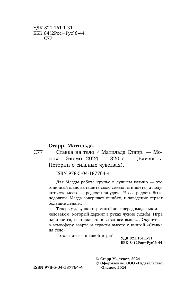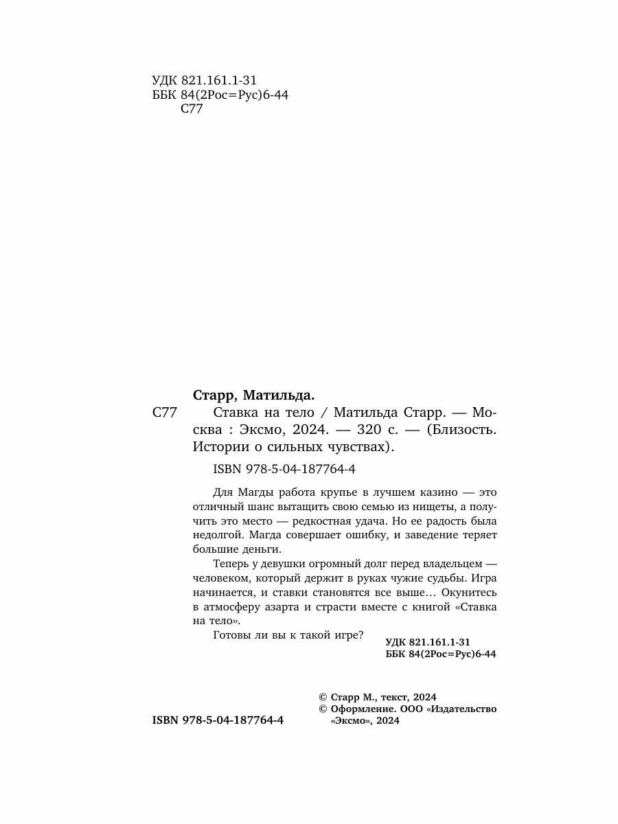 Сервис сравнения цен СкидкаГИД предлагает сравнить цены на товар «Книга: Ставка на тело (Старр Матильда); ООО "Издательство "Эксмо", 2024»