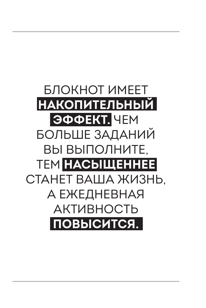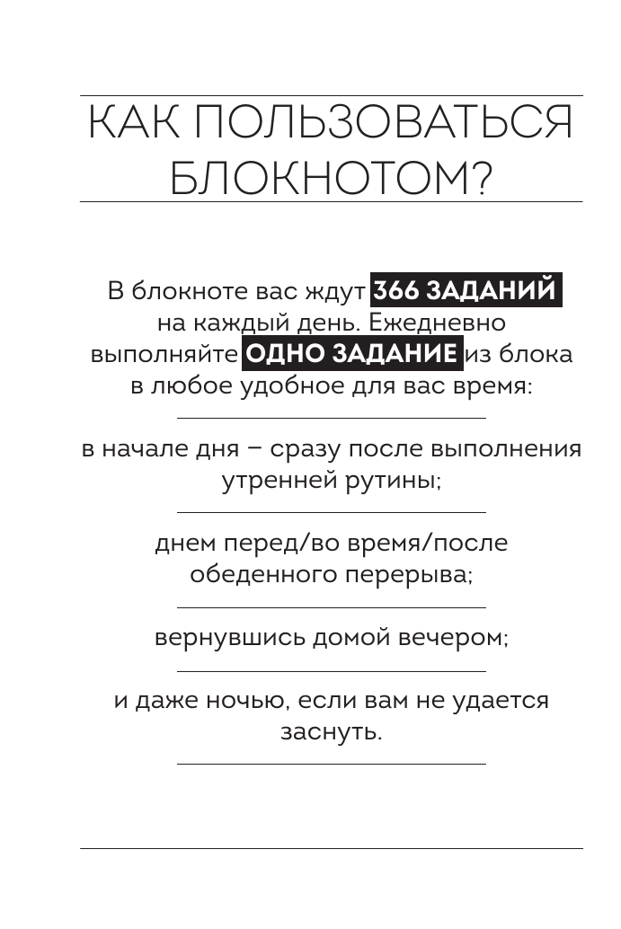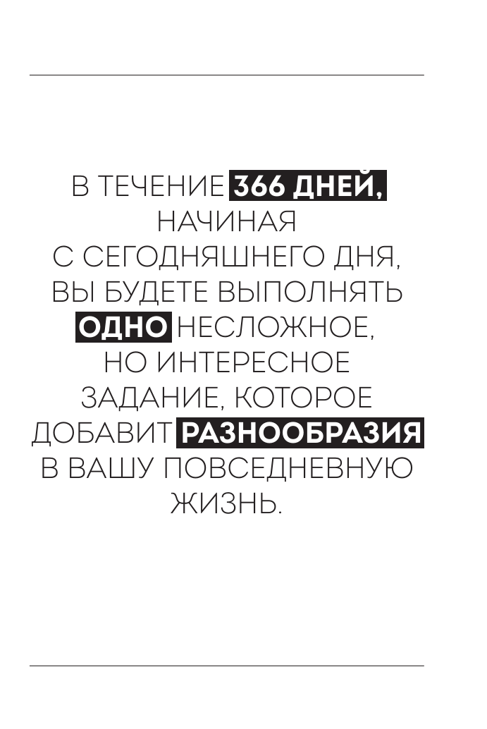В блокноте собрано 366 заданий на каждый день. Ежедневно выполняйте одно задание в любое удобное для вас время. Чем больше заданий вы выполните, тем насыщеннее станет ваша жизнь.