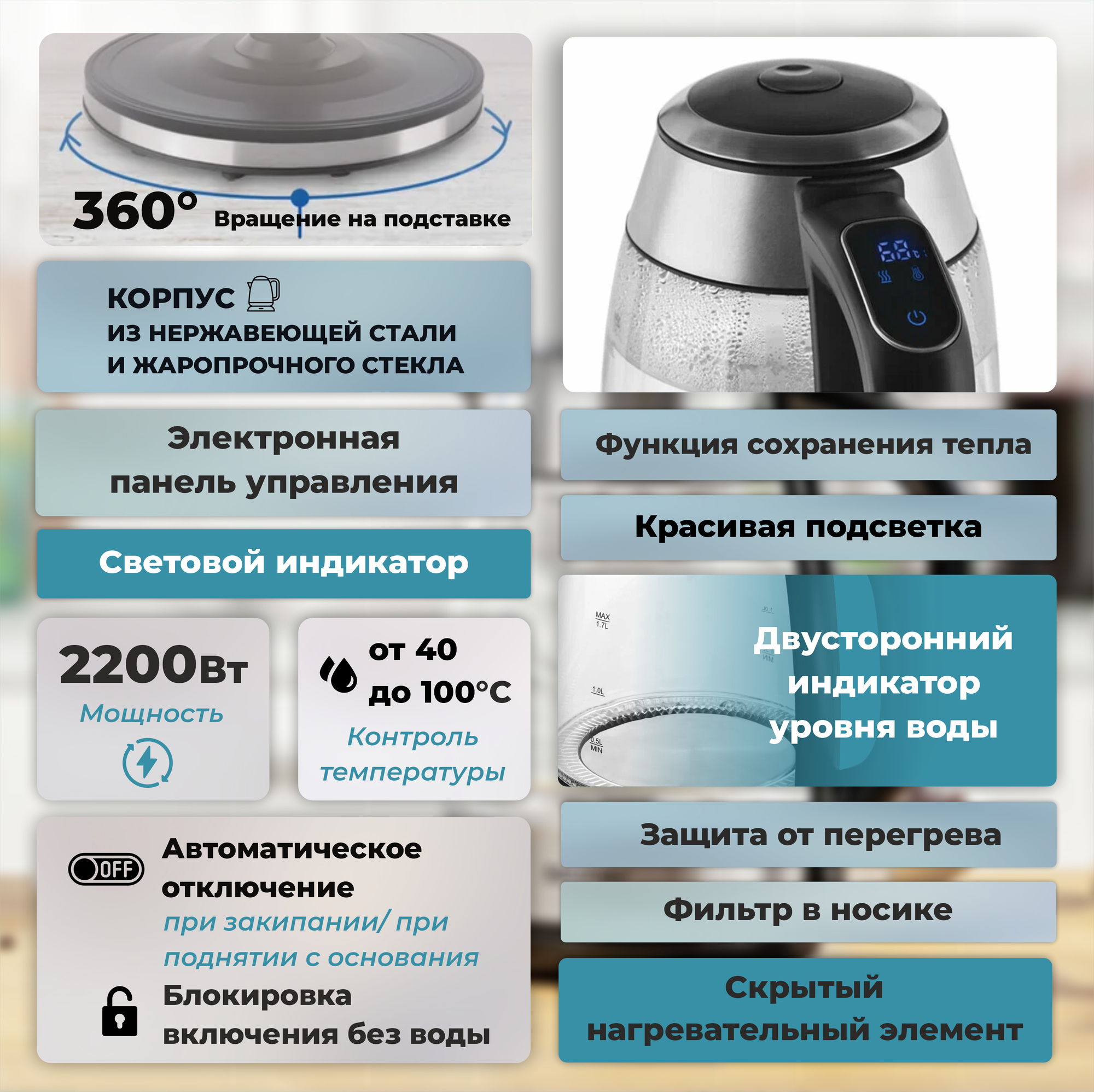 | Защита | автоотключение при закипании, автоотключение при снятии с подставки, автоотключение при отсутствии воды |