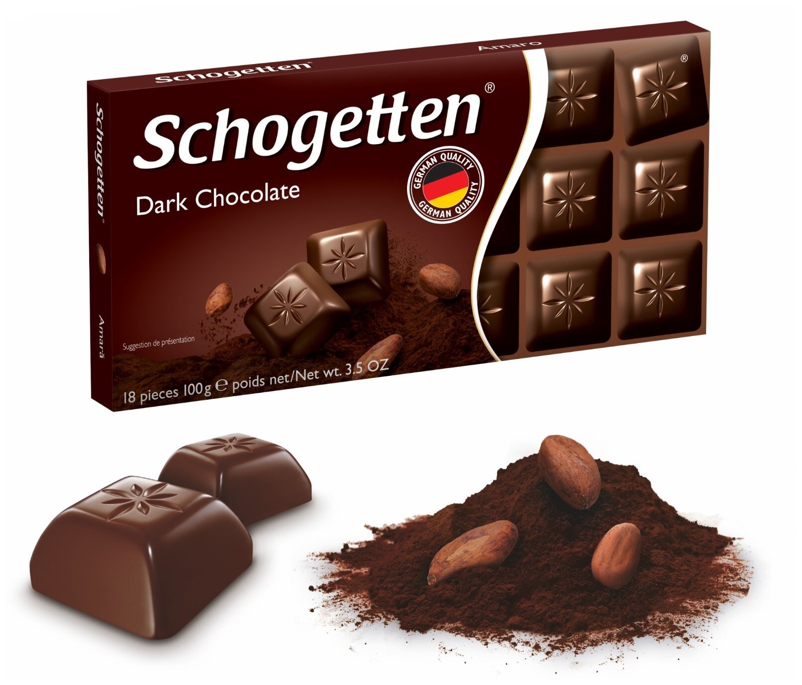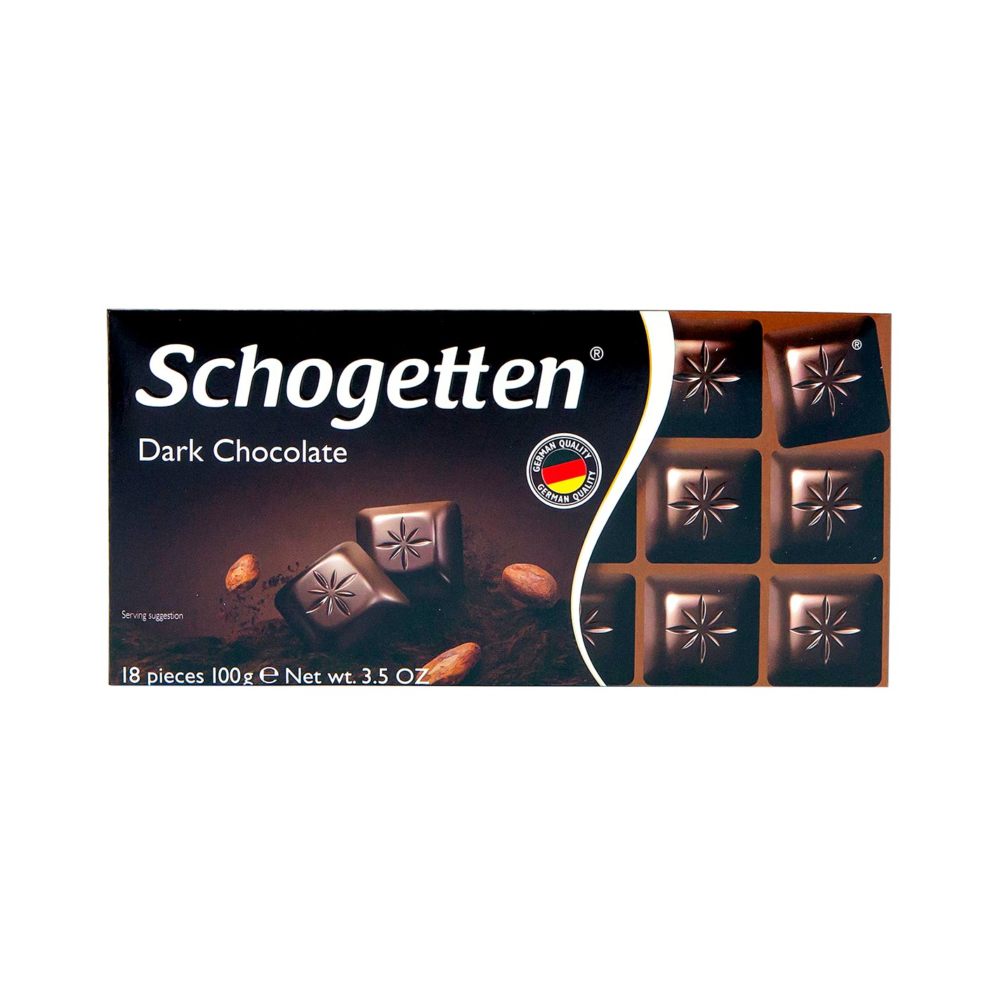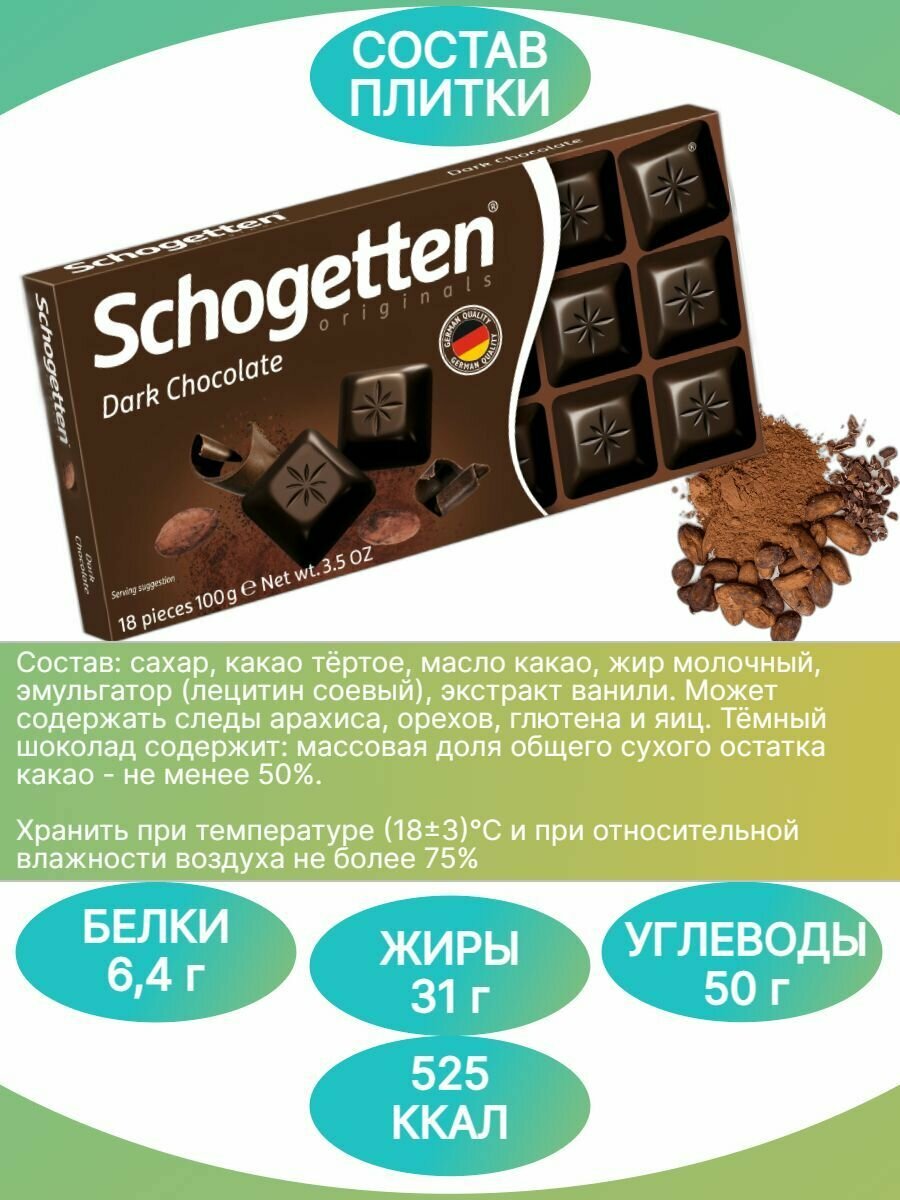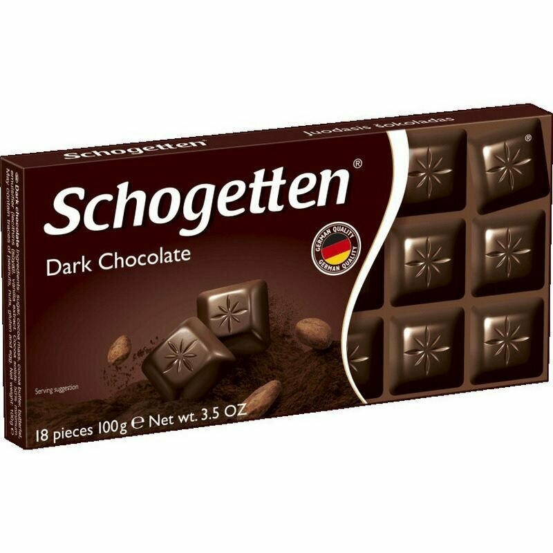 Шоколад Schogetten это очень вкусный и качественный немецкий шоколад. Уникальность этого шоколада не только в его рецептуре, но и в форме. В упаковке вы не найдете цельной плитки: она уже поделена на аккуратные квадратные ломтики с фирменным оттиском, разложенные на плотной картонной подложке. Такие кусочки удобно не только есть, но и подавать к чайному столу - их можно выложить в вазочку как оригинальные шоколадные конфеты