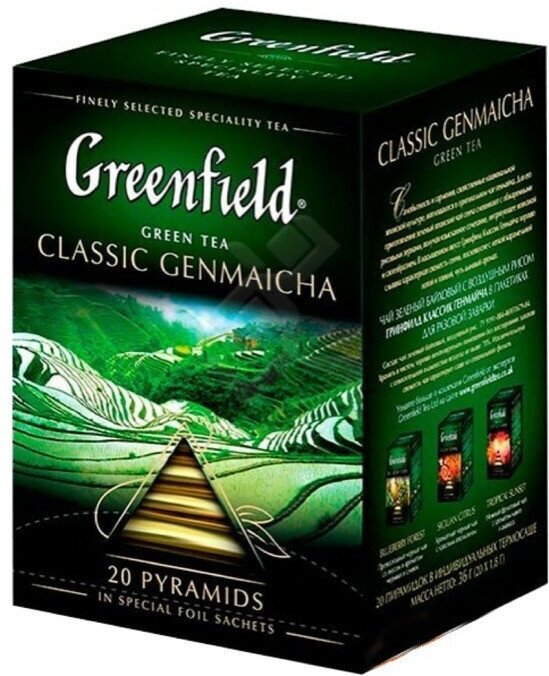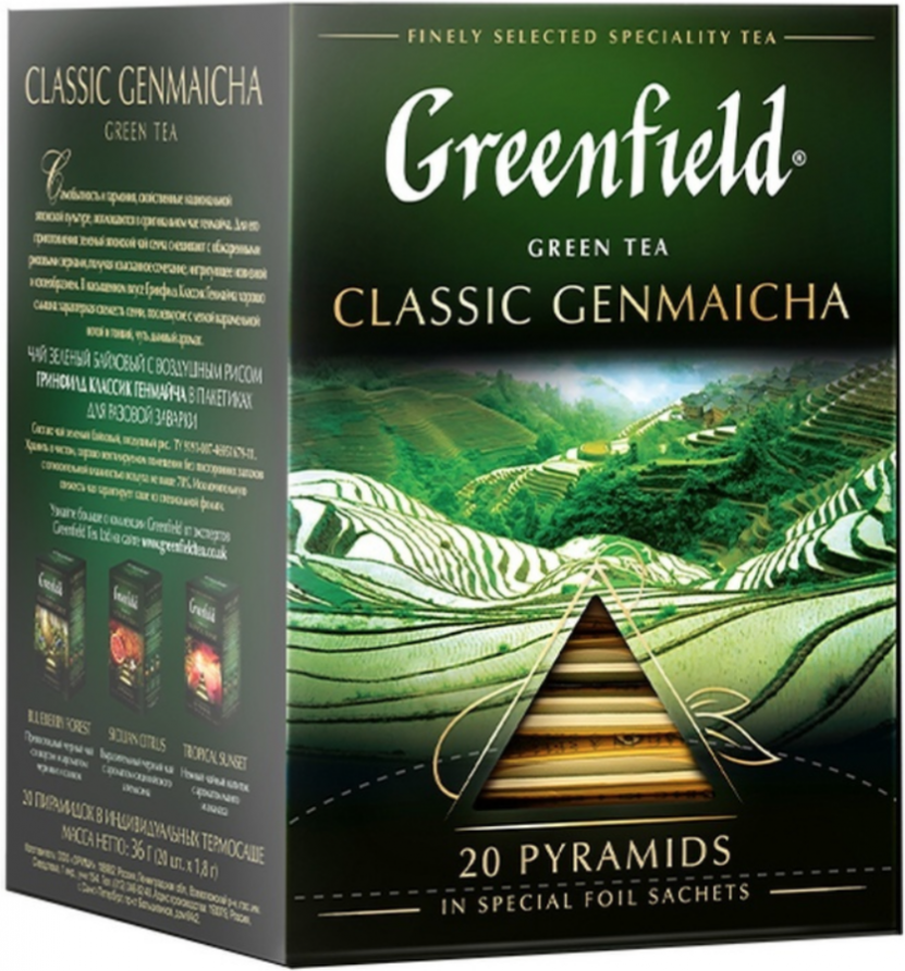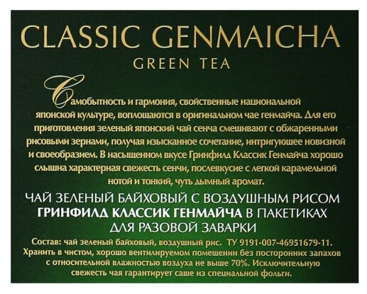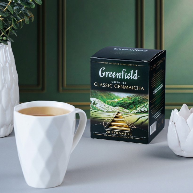 Самобытность игармония, свойственные национальной японской культуре, воплощаются воригинальном чае Greenfield Classic Genmaicha. Для его приготовления зеленый японский чай сенча смешивают собжаренными рисовыми зернами, получая изысканное сочетание, интригующее новизной исвоеобразием. Вэтом насыщенном вкусе хорошо слышна характерная свежесть сенчи, послевкусие слегкой карамельной нотой итонкий, чуть дымный аромат.