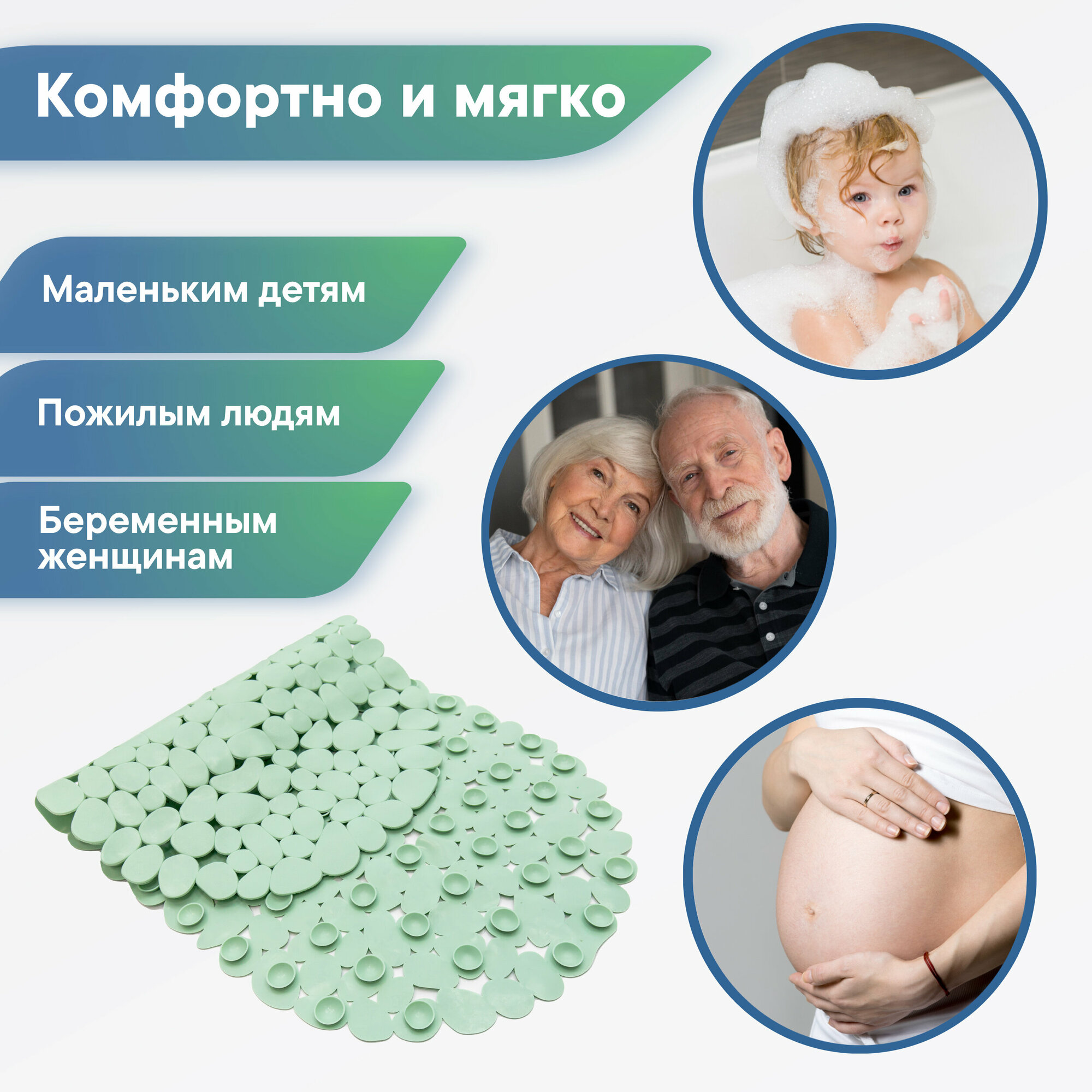 Коврик для ванной антискользящий, с присосками в форме морской гальки. Коврик выполнен в современных мягких пастельных тонах и впишется в любую ванную комнату.