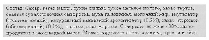 | Состав | сахар, какао-масло, пальмовое масло, сухие сливки, сухое цельное молоко, какао тертое, сладкая сухая молочная сыворотка, мука пшеничная, молочный жир, эмульгатор (лецитин соевый), натуральный ванильный ароматизатор (0,2%), какао порошок обезжиренный (0,1%), лактоза, пшеничный крахмал, натуральный ароматизатор, соль морская, разрыхлитель (гидрокарбонат натрия, гидрокарбонат аммония). |