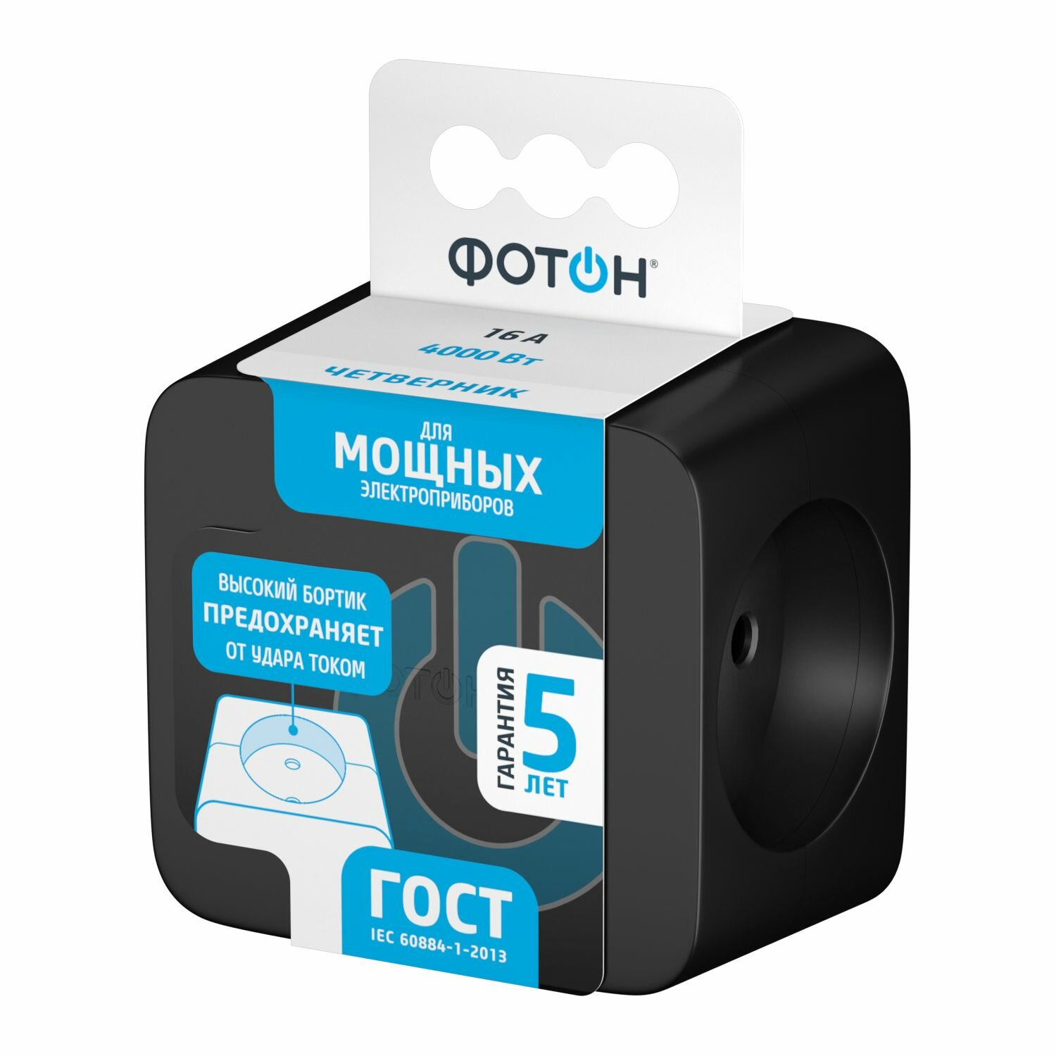 | Наименование модели | Разветвитель электрический четверник, куб ФОТОН АМ 16-4, 16А, черный, 25410 |